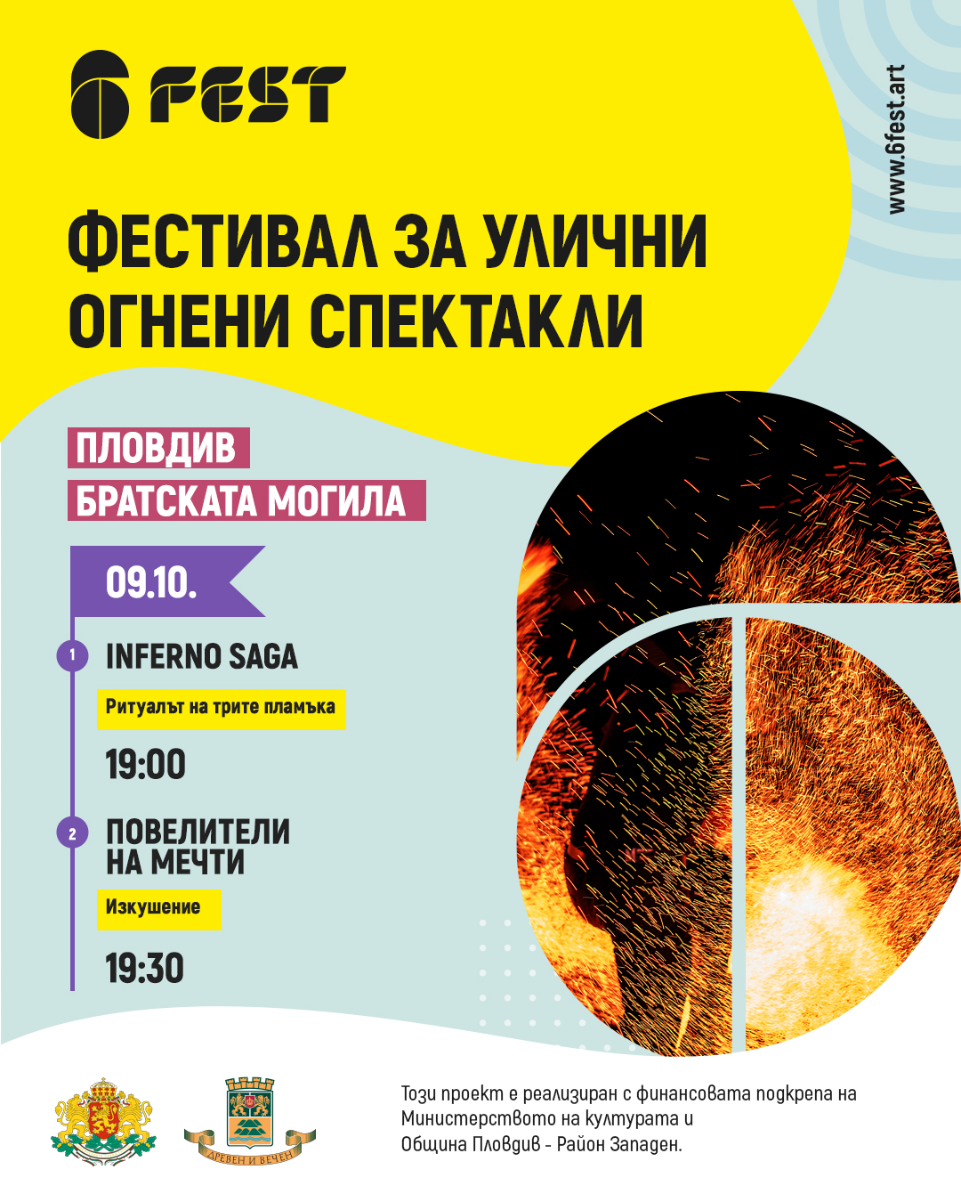 285 За първи път издание на Фестивал за улични изкуства 6Fest ще се случи едновременно в два града – на 9 октомври в Пловдив и на 10 и 11 октомври в Ямбол. Уличният фестивал се завръща със специалния си фестивален формат, посветен на огненото изкуство – „Фестивал за улични огнени спектакли 6Fest“. Първите две „огнени“ издания на 6Fest бяха също в Пловдив – през 2020 и 2022 г. В тридневната програма на предстоящото издание ще участват български „огнени“ групи и артисти – Inferno Saga, Повелители на мечти, Театър на огъня и сенките Fireter, Agnon Collective и Тихомир Димитров. 19-о подред в историята на 6Fest, това фестивално издание се осъществява с финансовата подкрепа на Министерството на културата, Община Ямбол и Община Пловдив – Район Западен. Входът за всички събития е свободен. Фестивалът ще бъде открит с две събития на площадното пространство при Братската могила в Пловдив на 9 октомври. От 19:00 ч. е „Ритуалът на трите пламъка“ на група „Inferno Saga“ (София). Трима „огнени пазители“ символизират три елемента – миналото, настоящето и бъдещето. Чрез игра с пламъка, всеки от тях разкрива своята сила, но едва когато тримата се обединят, огънят придобива истинска мощ. Вдъхновени от древни митове, съвременно театрално изкуство и ритъма на музиката, артистите от „Inferno Saga“ създават огнени истории, които се разказват не с думи, а с пламък, движение и енергия. От 19:30 ч. е „Изкушение“ на групата „Повелители на мечти“ (Стара Загора). Спектакълът изследва темата за връзките помежду ни – физически, емоционални и психически, – които водят до съблазън, разделение и възстановяване. „Повелители на мечти“ е театрално-огнена формация, създадена през 2023 г., чиято цел е да популяризира у нас невербалния театър, огненото и цирковото изкуство, с фокус върху представления на открито, извън конвенционалните театрални сцени. На 10 и 11 октомври фестивалът 6Fest се пренася в Ямбол. На пешеходната ул. „Г. С. Раковски“, пред Пощата, на 10 октомври зрителите в Ямбол ще могат да гледат три спектакъла – на „Inferno Saga“, „Повелители на Мечти“, както и „Самодивата“ на групата „Agnon Collective“ (София), която обединява млади артисти от София, работещи в сферата на огнения танц. Фестивалната програма на 11 октомври в Ямбол ще започне с огнено-акробатичния спектакъл „Драгониус“ на Театър на огъня и сенките Fireter (София), в който ще видим артисти на кокили във футуристични облекла и причудлива машина с драконовска глава и железни криле. В програмата за деня има още два спектакъла – „Медитиращите“ на „Agnon Collective“ и “On Fire” на Тихомир Димитров, мултижанров артист, творящ в сферата на цирка, огнените изкуства и клоунадата. Първите му стъпки като жонглиращ артист са през 2012 г. Участвал е в редица фестивали и жонгльорски конвенции в Европа и Азия, както и два пъти в обучителни събития на Паоло Нани, световно име в клоунадата. 6Fest е първият самостоятелно провеждащ се фестивал в България, посветен на изпълнителските улични изкуства като карнавал, съвременен цирк, куклен театър, живи статуи, огнени изкуства, кокили, улична магия, танц, музика и др. До момента 6Fest има 18 издания в 10 български града с участието на над 1000 артисти в над 200 събития. От 2019 г. основните издания на фестивала се провеждат в Пловдив. Мултижанровото международно издание на 6Fest тази година се състоя през април като част от Културния календар на Община Пловди