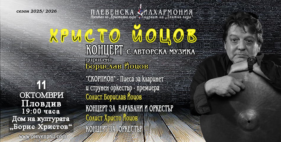 232 На 11 октомври 2025г., събота, от 19.00 часа, в Дома на културата „Борис Христов”, Плевенската филхармония, в партньорство с „Камерна сцена Пловдив“, ще гостува с концерт, включващ последната оригинална музика, създадена от големия български музикант Христо Йоцов. В програмата ще бъдат изпълнени три изключително любопитни и красиви произведения, които са премиера за публиката в Пловдив. Концертът е под диригентската палка на Борислав Йоцов, брат на композитора, и е част от Есенния салон на изкуствата в Пловдив. Публиката ще чуе: Христо Йоцов – „Скорпион“ – пиеса за кларинет и струнен оркестър – премиера за Пловдив, солист Борислав Йоцов – кларинет; Христо Йоцов – Концерт за барабани и оркестър, Солист: Христо Йоцов – ударни; Христо Йоцов – Концерт за оркестър – премиера, Диригент: маестро Борислав Йоцов. Христо Йоцов е творец, притежаващ изумителна способност да смесва различни музикални светове. Той е виртуозен инструменталист на ударни инструменти, но същевременно е и композитор, аранжор и педагог. Признат е за един от най-креативните и активни музиканти на българската джаз сцена, който непрекъснато създава оригинална музика и нови проекти, в които активно привлича и подкрепя млади таланти. В своите произведения той органично съчетава класическите форми и джаз импровизацията. Пише музика за биг-бенд и джаз формации, но също така и симфонични, филмови и театрални творби. Въпреки че е джаз музикант, в творчеството му се усеща принадлежност към българската композиторска школа. Той умело използва инструментални теми, вдъхновени от българската песенна традиция. Съчетава нестандартни инструменти в оркестъра и работи с различни музиканти, а музиката му се характеризира с движение, динамика, цвят и емоция. „Камерна сцена Пловдив“ се осъществява с подкрепата на община Пловдив и е част от Културния календар на града за 2025 година. Билети се продават в мрежите на EVENTIM и GRABO, както и на място преди концерта. Може да ви хареса също Носителят на няколко награди Оскар и БАФТА “Едит Пиаф: Живот в розово” с Марион Котияр и “Без конкуренция” на Парк Чан – Уук в последния ден на Киномания в Пловдив Време е за „Светлина и надежда в Стария град“ Музейни експерти от цялата страна обсъждат нови хоризонти за природонаучните музеи в Пловдив Традиции и фолклор за най-малките на коледните образователни концерти на ФА „Тракия“