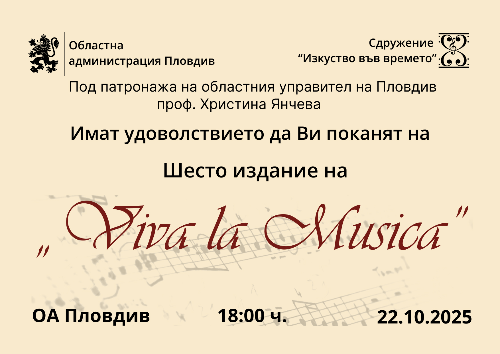 339 Сдружение „Изкуство във времето“ ще открие в сряда своя шести творческия сезон в камерното пространство на Областна Администрация – Пловдив. Тазгодишното издание на „Viva la musica“ артистите и гостите на сдружението са посветили на популяризирането на химна на Пловдив, който ще прозвучи в изпълнение на две оперни певици и камерен оркестър. Музикалното събитие се организира от Сдружение „Изкуство във времето“ с председател д-р Злателина Коларова и под патронажа на областния управител на Пловдив, проф. Христина Янчева. „Нашата цел е да представим по един различен начин химна на Пловдив, чиято музика е създадена по прекрасния текст на поета Георги Анастасов от композитора Георги Славчев. Нашето сдружение е направило специален аранжимент за камерен състав. Надяваме се в края на изпълнението всички гости да запеят заедно с нас“, сподели преди концерта д-р Злателина Коларова. Концертът ще се състои на 22.10.2025 г. (сряда) от 18:00 часа в сградата на Областна администрация – Пловдив, а входът е свободен. В него участие ще вземат Павел Генов (цигулка), Никола Николов (виолончело) и Злателина Коларова (пиано). Гост-изпълнители са: Ивелина Рашкова (сопрано), Мария Стоименова (сопрано) и учениците цигулари от НУМТИ „Добрин Петков“ – Калина Борисова, Александър Димитров, Адам Рамадан и Теодора Василева. В програмата ще чуете творби от М. Преториус, Л. Бокерини, Чайковски, Ф. Лехар, Г. Славчев и др. Сдружение „Изкуство във времето“ е създадено през 2020 г. с цел разширяване на аудиторията на класическата камерна музика, обогатяване на градската интонационна среда с нетрадиционни форми на общуване с нея, децентрализация на културните процеси, утвърждаване на нови алтернативни пространства за изкуство, образование и естетическо възпитание на публиката. Може да ви хареса също AL BANO: Да пея на сцена като Античния театър в Пловдив е чест и вдъхновение Ансамбъл „Тракия“ с нов мащабен спектакъл, вдъхновен от река Марица България с пълен национален отбор за Европейското първенство по стрелба с лък в Пловдив Регионален етнографски музей – Пловдив с работилници за мартеници