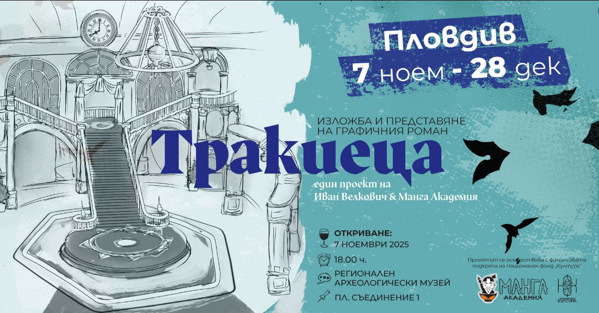 316 На 7 ноември, от 18 ч. в Регионален археологически музей – Пловдив ще бъде открита гостуващата изложба „Тракиеца“ – графичен роман, създаден в сътрудничество между екипа и учениците на Манга Академия и сръбския творец Иван Велкович. Проектът обединява фентъзи и научна фантастика с елементи от балканската култура и история, пренасяйки публиката в алтернативна вселена, където минало и бъдеще се преплитат. Главният герой – Тракиеца – е загадъчен пътешественик във времето, чиято мисия остава неясна до самия край. Сред стражи роботи, магически портали и паралелни реалности се разгръща история за смелост, приятелство и силата на човешкия избор. Изложбата показва пътя на създаването на романа – от първите идеи и скици до завършените страници. Тя разказва и за общността зад проекта – млади автори от Манга Академия, които в продължение на почти четири години работят рамо до рамо с професионалисти от България и Сърбия. „Тракиеца“ е вдъхновяващ пример за творческо сътрудничество и за силата на въображението, което обединява поколения и култури чрез езика на изкуството. Работилница за създаване на комикси в екип На 8 ноември от 10:30 ч., нашите приятели от Манга Академия ще проведат специална работилница за младежи на 14+ години за създаване на комикси в екип, в която ще можете да научите повече за рисуването на комикси и как да ги създавате с приятели. Събитието е безплатно, но местата за участие са ограничени, затова не пропускайте да се запишете предварително. Регистрацията се извършва само чрез онлайн формата, предоставена от организаторите. Последвайте линка по-долу, за да запазите своето място и да станете част от това творческо приключение! Може да ви хареса също Виртуозният пианист Монах Авел, превърнал изкуството в молитва, за първи път с концерт в Пловдив Латино джаз вулкан избухва в Пловдив: Dan Costa Quartet свири в Клуб В Джаза С награждаване и откриване на изложба приключва VIII Национален ученически конкурс Плакат – Костадин Отонов 2025 г. БГ ДУЕТЪТ представя Коледен концерт в Пловдив