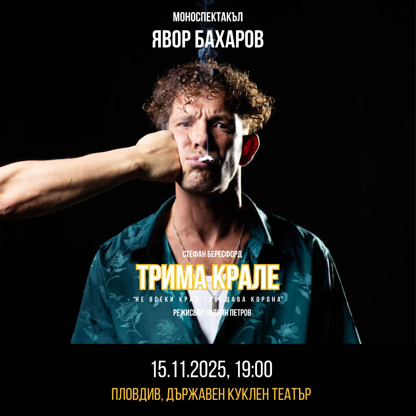 26 Актьорът Явор Бахаров представя един необичаен и дълбоко личен моноспектакъл по пиесата на британския драматург Стефан Бересфорд. Премиерата на „Трима крале“ в Пловдив е на 15 ноември на сцената на Държавен куклен театър и е част от програмата на тазгодишното издание на Нощ на театрите. Началото е в 19.00 часа. „Трима крале“ е история за три поколения мъже, свързани от сложните отношения между бащи и синове. През личната изповед на героя, спектакълът разглежда наследените модели на поведение, които често ни определят, дори когато се опитваме да избягаме от тях. В сърцевината на спектакъла стои идеята, че човек наследява не само черти и навици, но и емоционални модели, страхове и неизказани думи, които се предават от поколение на поколение. Това е онова невидимо наследство, което никой не е искал, но всички носим. Не всеки „крал“ завещава корона…. Пиесата поставя въпроси, които засягат всеки от нас: трябва ли да приемем миналото си такова, каквото е? Да съдим ли предците си за техните грешки, или да се опитаме да простим? Авторът Стефан Бересфорд е носител на наградата БАФТА и един от най-значимите съвременни автори в британския театър и кино. Режисьор е Юлиан Петров – актьор, режисьор и преподавател, познат на публиката с редица театрални и телевизионни проекти, които изследват човешката уязвимост и търсенето на смисъл. Спектакълът е с продължителност 50 минути и се развива в интимна театрална среда, в която публиката остава насаме със себе си, думите и спомените. „Съвсем скоро се навършиха 14 години от смъртта на баща ми. И с времето разбрах, че човек започва истински да опознава родителите си едва след като ги изгуби…Тази мисъл стои и в сърцевината на спектакъла „Трима крале“. Посвещавам го на живите ни роднини – онези, които продължават да ни помагат и обичат въпреки всичко! На баща ми, там… На майка ми, тук…!“ – Явор Бахаров Билети за премиерата на „Трима крале“ се продават в мрежата на Ивентим. Може да ви хареса също Киномания в Пловдив идва с филми с Ал Пачино, Уилям Дефо и куп други звезди Киномания в Пловдив идва с филми с Ал Пачино, Уилям Дефо и куп други звезди Уикенд на двукрилите в Регионален природонаучен музей – Пловдив МФ „Дни на музиката Балабановата къща“ посвещава концерт на композиторите – рицари на авангарда на XX век