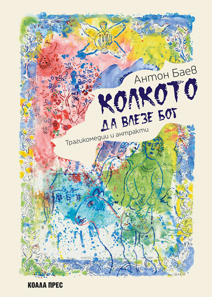 10 Издателска къща „КОАЛА ПРЕС“ представя новата книга на Антон Баев „Колкото да влезе Бог“. Книгата е финансирана от Община Пловдив по Компонент 4 „Произведения на пловдивски писатели и важни за града издания“. „Колкото да влезе Бог“ е най-мултижанровата книга на Антон Баев, която включва 4 трагикомедии, предхождани от 4 welcome drink сатирични тостове, и още толкова антракти, които пък са съставени от свръхкъси разкази, цикъл стихове, по-дълги разкази, и пътеписи за градове и хора. Това е и най-ироничната книга на автора, в която рефлексиите върху националните съдбини минават през личната история. Своеобразен дамаскин от ХХI в., в който свободата на въображението и стихията на разказното слово са спойката между текстовете, а вездесъщият герой на автора – Спас Господов, появил се за първи път в книга преди 20 години, лети през векове и граници, руши държави и исторически времена, семейни спални и храмове, за да… ами за да спаси Господ, каквато е мисията му, закодирана в рожденото име. Антон Баев (1963) e роден в Пловдив. Автор е на 15 книги (поезия, проза, монографии), издадени през този век, и още 10 – през миналия. Доктор по Българска литература от Института за литература на БАН (2009). Специализирал Регионална журналистика по програма на Iowa State University и United States Information Agency (1994) в САЩ. Основател и директор на Международния фестивал за поезия „Орфей – Пловдив“ от 2017 г. Негови книги и отделни творби са превеждани на английски, немски, френски, турски, италиански, испански, гръцки, хърватски, сръбски, датски, чешки, словашки, македонски, иврит, албански, руски, хинди. Както отбелязва Чехов, ако една пиеса е добра, достатъчно е тя да бъде прочетена. Артистите, режисьорът и сценографията са напълно излишни. Това е и единственото ми основание да издам тази книга – тест за домашен театър, каквото всъщност е четенето. Четенето е сцена, думите са актьори, ако се опра на другия театрален пилон. Струва ми се, че трагикомедията е модерен опит да се съчетае изкусността на трагиците с изкуството на комиците. Известно е, че Чехов е смятал пиесите си за комедии, но те са поставяни като трагедии. Какво се е получило с моите четирите опита за εἰρωνεία и още толкова антракта? Най-вероятно – трагикомични инцести. Приятно четене! Антон Баев Откъс Бог Казваше се Богдан. Дълго време бяхме съквартиранти. Още в началото ми каза, че не познавал майка си и баща си. Затова го нарекох Бог. Влизаше толкова тихо в студентската ни квартира, че не усещах кога е вътре и кога – вън. Но в един момент ми се стори, че никога не е излизал. А в друг – че никога не е влизал. Безшумно същество. Такъв беше Богдан. Дори не знам какво сме си говорили и ако не беше тефтерът, в който си водех записки, сигурно споменът ми от него щеше да е безплътен. Но ето какво съм си записвал тогава, когато Бог не си бе отишъл: „Пътят към дома върви от нафс ал-аммара[1] към нафс ал-камил[2]. Бог е във всяко създание, защото Той е създателят“. Ходеше в бели одежди. Но понякога се появяваше в зелени, друг път – в черни, а рядко – и в червени. Казваше за себе си, че е инсан[3], човек, който бяга. „Където и да си, каквото и да правиш: обичай“ – повтаряше този съвет на Руми[4]. Спомените, представите, мислите, чувствата – всичко е в тялото, и ако него го няма, няма ги и тях. Може би остават в някакви откъслечни записки из пожълтели тефтери, но целостта е 