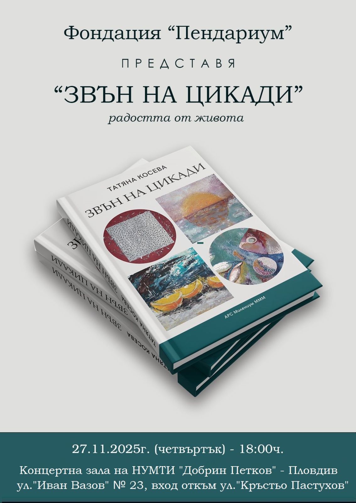 329 На 27 ноември 2025 г., четвъртък, от 18:00 ч., Концертната зала на Национално училище за музикално и танцово изкуство „Добрин Петков“ в Пловдив ще отвори своите врати за едно вдъхновяващо творческо преживяване – официалното представяне на „Звън на цикади“. Това събитие не е просто представяне на поетична книга с автор Татяна Косева, а духовно пътуване през тишината към пробуждането на човешката душа. То се реализира от Фондация за изкуство и култура „Пендариум“ в партньорство и с любезното домакинство на НУМТИ „Добрин Петков“. Сред специалните гости ще са знаменитото сопрано Райна Инфантино, световноизвестният цигулар маестро Мичо Димитров, както и други приятели, изтъкнати творци и видни представители на пловдивската институционална и гражданска общественост. Водещ на вечерта ще бъде Рамела Бохосян – творец, който с лекота превръща думите в светлина. Фондация „Пендариум“ е създадена с ясната мисия да свързва различни творчески езици и да създава пространства, в които културата се преживява като дълбок духовен акт. Тя вярва в силата на изкуството да трансформира и обединява. Именно в този дух е създаден и концептуалният творчески проект „Звън на цикади“, в който слово, музика и визуално изкуство се преплитат в един завладяващ и прекрасен диалог. Самото издание е истинско полиграфическо бижу, вдъхновено от древната символика на цикадата – архетип на човешката душа, която след дълъг период на мълчание излиза на светло, за да изговори себе си. Художественото оформление на книгата е дело на Цветелина Русалиева. В изповедните текстове оживяват универсалните теми за самотата и любовта, за болката и радостта, за търпението, вътрешната сила и благодарността – представени искрено, човешки и с голяма дълбочина.. Гостите на събитието ще имат уникалната възможност да се потопят в творческата атмосфера и да влязат в открит разговор с екипа, създал проекта. Вечерта ще бъде обогатена с живи музикални и видео интерпретации, специално вдъхновени от темите и емоциите, заложени в книгата. Очаква се една вълнуваща вечер, която ще докосне сетивата и ще предложи храна за размисъл. Входът е свободен. Адрес на събитието: Пловдив, НУМТИ „Добрин Петков“, ул. „Иван Вазов“ 23, вход откъм ул. „Кръстьо Пастухов“. Може да ви хареса също Международрн конкурс за музикално, танцово и изобразително изкуство „ОРФЕЕВИ ТАЛАНТИ“ Регионален природонаучен музей – Пловдив кани децата на „ПРИКЛЮЧЕНИЕ С ДИНОЗАВРИ“ Невена Цонева и „Баш Бенд“ пристигат утре в Пловдив за концерт, част от турнето „ЗАЕДНО“ Пловдив празнува 7 години от Европейска столица на културата с градския фестивал „Пловдив си ти“