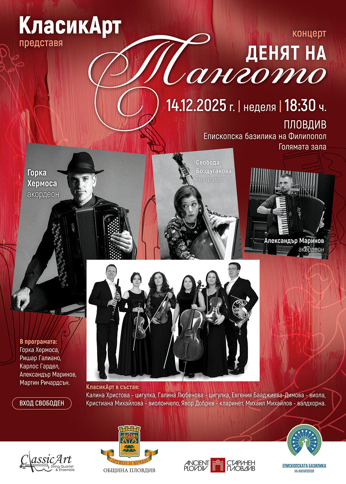 11 Тангото не е просто танц – то е пламенен диалог между сърца, история, разказана без думи, и музика, която превръща тъгата в страст, а копнежа – в елегантна стъпка. В неговата красота се крие вечната борба и помирение на човешките емоции, изразени чрез пронизващи мелодии и завладяващ ритъм. На 14 декември, точно в 18:30 ч., Епископската базилика на Филипопол в Пловдив ще се превърне в сцена на един музикален разказ, посветен на магията на тангото. Концертът, озаглавен „Денят на тангото“, обещава да потопи публиката в дълбините на този емоционален и изискан жанр, преминавайки границите на традиционното и докосвайки съвременното. Сцената ще събере изключителни музиканти, които ще преведат слушателите през богатия пейзаж на танго музиката. От Испания пристига виртуозът Горка Хермоса на баян, чието майсторство е признато в цял свят. Двамата, заедно с Александър Маринов – талантлив пловдивски акордеонист, преподавател и композитор, съставляват дуо – Хер/Мар. Към него ще се присъедини и Свобода Боздуганова – контрабас. Техният ансамбъл ще бъде допълнен от струнния квартет и духови инструменти на формация КласикАрт, в състав: Калина Христова – цигулка, Галина Любенова – цигулка, Евгения Бааджиева-Димова – виола, Кристиана Михайлова – виолончело, Явор Добрев – кларинет и Михаил Михайлов – валдхорна. В програмата на вечерта ще прозвучат творби, които са едновременно познати и неочаквани. Публиката ще има удоволствието да чуе легендарни мелодии от титани като Карлос Гардел, чието име е синоним на Златния век на тангото, както и модерните интерпретации на френския акордеонист и композитор Ришар Галиано. Специално място е отделено и за авторската музика на българския композитор Александър Маринов, както и на творби от Мартин Ричардсън, които разширяват границите на жанра. Концертът „Денят на тангото“ е покана за едно пътешествие в музикалното сърце на страстта. Той е част от мисията на организаторите да представят класическата и съвременна музика на широка публика. Входът за събитието е свободен до заемане на местата! Не пропускайте възможността да бъдете част от това завладяващо преживяване, където всяка нота носи духа на Буенос Айрес и всяка мелодия разказва вечната история на тангото. Може да ви хареса също Международният радио фестивал Тримонтиада кани на Коледен концерт с шедьоври от Бах Силата на малкия формат: Изложба „Малък формат“ 2025 на ”Дружество на пловдивските художници” Носителят на няколко награди Оскар и БАФТА “Едит Пиаф: Живот в розово” с Марион Котияр и “Без конкуренция” на Парк Чан – Уук в последния ден на Киномания в Пловдив Време е за „Светлина и надежда в Стария град“