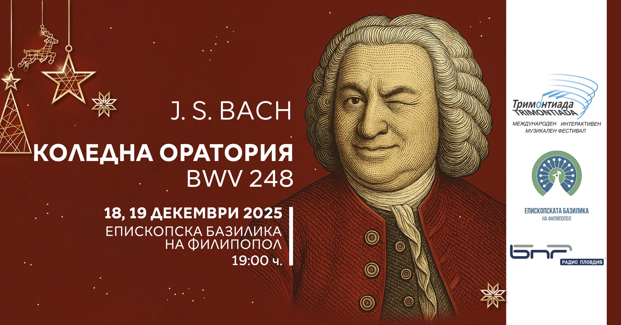 11 Международният радио фестивал за класическа музика „Тримонтиада“ отправя своята празнична покана към всички ценители на класиката за един прелестен и незабравим Коледен концерт. В духа на най-светлия християнски празник, фестивалът ще представи част от гениалната „Коледна оратория“ BWV 248 на Йохан Себастиан Бах. Поради изключително големия интерес, проявен към събитието, организаторите взеха решение концертът да се проведе в две идентични празнични вечери: 18 и 19 декември 2025 г., начало в 19:00 ч., място: Епископска базилика на Филипопол. В сърцето на програмата е „Коледна оратория“ BWV 248 – величествено произведение, написано от Бах през 1734 г. за прослава на Рождество Христово. Ораторията се състои от шест отделни кантати. Тази година, „Тримонтиада“ предлага внимателно селектиран музикален фокус. Кантата №1 ще бъде изпълнена цялостно – както и през 2023 г., когато пловдивската публика имаше възможност да чуе и Кантата №6. Програмата ще бъде допълнена от най-интензивните и ярки музикални шедьоври за солисти, хор и оркестър, избрани от Кантати №2, 3, 4, 5 и 6. На сцената ще заблести звезден международен състав: диригент – Петер Кооий (Холандия) и солисти: Сузана Лукашевич (сопран), Ейлис Декстер (алт), Давид Ферейра (тенор), Серж-Етиен Фрайтаг (бас). Оркестър и Хор: Камерен хор „Иван Спасов”, Младежки камерен оркестър „Франк Мартен Плейърс“ (с концертмайстор Тодор Георгиев). Диригент на хора е Гергана Люцканова (България). С този празничен концерт, фестивал „Тримонтиада“ благодари на пловдивската публика за трайната подкрепа и любов към класическата музика. Организаторите са щастливи да посрещнат Коледа с пловдивската публика по един от най-вълнуващите начини – чрез музиката на Бах. Вход с билети по 25 лв. (местата са ограничени!) може да откриете на каса МаскАрт в Дом на културата „Борис Христов“. Онлайн билети: 18 декември: https://grabo.bg/08urdn ; 19 декември: https://grabo.bg/0rzt5zm Може да ви хареса също Денят на тангото: Емоционален концерт с вход свободен в Епископската базилика в Пловдив Силата на малкия формат: Изложба „Малък формат“ 2025 на ”Дружество на пловдивските художници” Носителят на няколко награди Оскар и БАФТА “Едит Пиаф: Живот в розово” с Марион Котияр и “Без конкуренция” на Парк Чан – Уук в последния ден на Киномания в Пловдив Време е за „Светлина и надежда в Стария град“