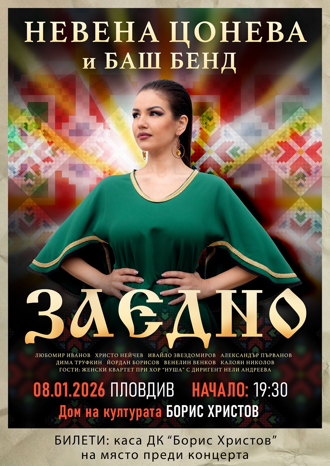 312 Невена Цонева и Баш Бенд канят пловдивчани и гости на града на спираща дъха среща на 8 януари 2026 г. от 19.30 часа в Дом на културата „Борис Христов“, част от дългоочакваното им турне „ЗАЕДНО“. Публиката ще се потопи в един музикален свят, където талантът среща корена, а емоцията прелива в майсторски аранжименти, обещават организаторите на събитието. Още от победата си в първото издание на „Music Idol“, Невена Цонева се утвърди като едно от най-ярките и многопластови имена на българската музикална сцена. С глас, който обхваща впечатляващ диапазон и способност да преминава с лекота през различни жанрове – от поп и рок до джаз и автентичен фолклор – Невена не просто изпълнява песни, тя разказва истории, които докосват дълбоко сърцето. Със своята артистичност и отдаденост, тя продължава да вдъхновява, а съвместната ѝ работа с Баш Бенд доказва, че българската музика има силата да свързва минало и настояще по най-красивия начин. В центъра на концерта стоят песните от албума „Тук сме“ – един проект, роден от дълбоко вдъхновение и посветен изцяло на връзката с публиката. Емоционалните и много искрени песни на Невена Цонева са подкрепени от виртуозността на Баш Бенд. Тяхната музика е мост между съвременния звук и вечните български мелодии, поднесена с брилянтни и неочаквани аранжименти. Атмосферата ще бъде допълнена от специалните гости на турнето: обичаната народна певица Нели Андреева и женски квартет към хор „Нуша“. Тяхното присъствие ще добави богатство от фолклорни обработки и вълнуващи вокални хармонии, които ще превърнат вечерта във феерия от звуци, напомнящи за корена и душата на България. „ЗАЕДНО е повече от концерт – това е призив да пеем, да чувстваме и да бъдем сплотени в силата на музиката. Не пропускайте възможността да бъдете част от това музикално събитие, което ще бъде истински празник за сетивата. Очакваме ви, за да създадем този незабравим спомен ЗАЕДНО“, споделят още организаторите. Интересен момент в организацията на концерта е и възможността за участие в специална игра. Всеки, закупил билет, може да участва в томбола за спечелване на голямата награда – 55“ телевизор LG с изкуствен интелект. Повече информация можете да намерите тук: https://www.facebook.com/reel/1736006340331944 Билети се продават в GRABO, Билетна каса МаскАрт в ДК „Борис Христов“ и на място, преди концерта. Може да ви хареса също AL BANO: Да пея на сцена като Античния театър в Пловдив е чест и вдъхновение Ансамбъл „Тракия“ с нов мащабен спектакъл, вдъхновен от река Марица България с пълен национален отбор за Европейското първенство по стрелба с лък в Пловдив Регионален етнографски музей – Пловдив с работилници за мартеници