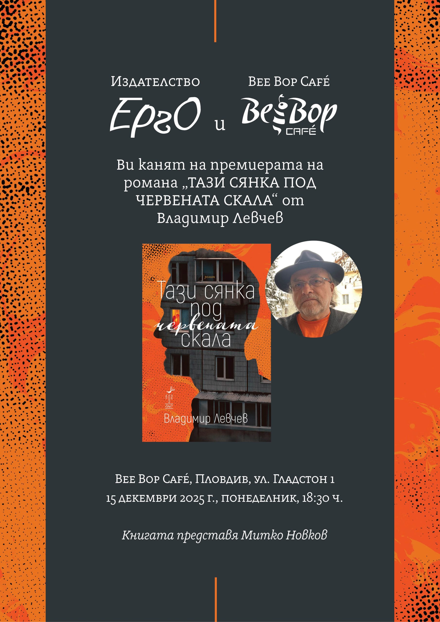 29 Издателство „Ерго“ и Bee Bop Café канят пловдивската публика на премиера в Пловдив на романа „Тази сянка под червената скала“ от Владимир Левчев. Събитието ще се състои на 15 декември, понеделник, от 18:30 часа, в Bee Bop Café, гр. Пловдив, ул. „Гладстон“ № 1. Книгата ще представи литературният критик Митко Новков, с участието на автора Владимир Левчев. „Тази сянка под червената скала“ е роман за американската мечта и нейното сбъдване, или пък несбъдване, на Балканите и в Америка. Също така роман за един любовен триъгълник, с криминален оттенък, в който третият остава невидим. Психологическа драма, която се разиграва в България, в Съединените щати и във виртуалното пространство, на фона на важни исторически събития – от лагера в Ловеч в началото на 1960-те, до турбуленциите в България през 1990-те, годините на „прехода“, и живота на българската имиграция в САЩ по онова време. Книгата е променена и разширена версия на романа „Човекът и сянката“, публикуван през 2012 г. Може да ви хареса също Възрожденски ритуал оживя на еснафския празник в Пловдив Танцово студио DS Magnifique кани на празнична Коледна гала вечер с два концерта От класната стая до книжния рафт: 11-класникът Крис Каблешков представя дебютния си роман „Мадам Маделин Де Фредерикас“ С шествие в Стария град отбелязват еснафския празник на 12 декември