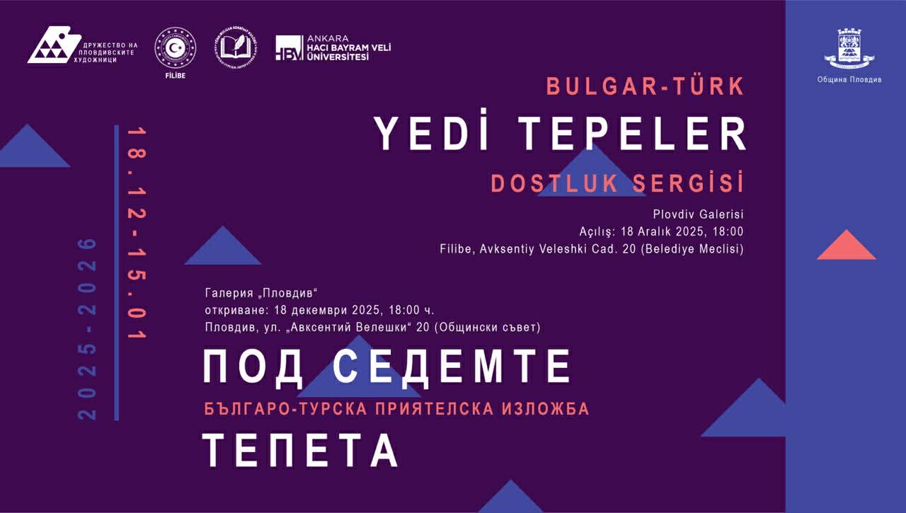 429В сърцето на един от най-древните живи градове в света, където културите се преплитат от векове, изкуството отново ще докаже, че за приятелството няма граници. Дружеството на пловдивските художници има удоволствието да покани гражданите и гостите на Пловдив на откриването на мащабната българо-турска изложба със знаковото име „Под седемте тепета“.Събитието ще бъде тържествено открито на 18 декември (четвъртък) от 18:00 ч. в Галерия „Пловдив“ (ул. „Авксентий Велешки“ 20, сградата на Общинския съвет).Изложбата е плод на вдъхновяващото сътрудничество между Генералното консулство на Република Турция в Пловдив и Българо-турския литературен клуб. Проектът цели да поддържа живото културно взаимодействие в нашия космополитен град, превръщайки галерийното пространство в поле за диалог и сплотеност, да утвърждава културния обмен, взаимното уважение и традиционно добрите връзки между двата народа.Куратор на експозицията е г-жа Айнур Каплан от Измир – художничка, родена в България, чиято мисия е изграждането на културни мостове. С над 50 организирани съвместни събития зад гърба си, тя събира в Пловдив 30 утвърдени автори от различни точки на Турция – университетски преподаватели, галеристи и творци с международно признание. От българска страна се включват 30 изявени пловдивски автори, сред които преподаватели в АМТИИ и Художествената гимназия, чиито имена са дълбоко вплетени в съвременния художествен живот на страната. Визуалната концепция на събитието е дело на доц. д-р Александър Гьошев.„Тази изложба е празник на изкуството, което не разделя, а обединява. Тук границите се превръщат в мостове. Галерия “Пловдив” ще се превърне в поле на приятелски срещи, културни връзки и празник на изкуството, за което няма граници, няма разделение и има сплотеност. Изложбата няма да бъде само единична проява, идеята е да се създаде трайно сътрудничество и споделени културни изяви. Създаден е дигитален двуезичен каталог, който ще бъде разпространен и ще запази това събитие във времето“ , споделят организаторите.Събитието се провежда под патронажа на Генералния консул на Република Турция в Пловдив, г-н Емре Манав. Проектът се осъществява с любезната подкрепа на Факултета по изящни изкуства към Университета „Хаджи Байрам Вели“ (Анкара) и Културно-литературното списание „Нöбет Тепе“ (Пловдив).Участват:От Турция: Prof. Birsen Çeken, Prof. Bünyamin Özgültekin, Prof. Dr. Oğuz Yurttadur, Prof. Dr. Zuhal Arda, Doç. Dr. Hülya Küpçüoğlu, Dr. Öğretim Üyesi Orhan Doğru, Alper Türkyılmaz, Anastasia Krykina, Aynur Mahmudova Kaplan /куратор/, Ayten Namlı, Ayşen Can, Bilhan Cuya, Bülent Yavuz Yılmaz, Bünyamin Ağbal, Canan Gündüz Yılmaz, Çiğdem Kalkan Ağbal, Dilek Bozkurt, Dilek Çiçek Karanlık, Emine Kasap Karakoç, Emine Şener Cerrahoğlu, Gülsün Erbil, Lale Temelkuran, Lütfiye Yazan, Mehmet Hacıfettahoğlu, Melodi Abedy, Mustafa Burhan Esen, Nilgün Ayşecik Çevik, Özlem Kireçoğlu Yavuz, Sebahat Arslan, Seval Özgeçen Sağlam, Tülay Deniz, Ziver KaplanОт България:Александър Гьошев, Ангел Китипов, Борислава Сотирова, Васил Тенев, Вихра Григорова, Даниела Стоянова, Диана Папазова, Димитър Апостолов, Емилия Арабаджиева, Жорж Трак, Зина Жекова, Иван Минков, Иван Чакъров, Ирина Гърдева, Калин Ангелов, Маргарита Джарова, Михаил Маламски, Николай Рогачев, Осман Юсеинов, Панайот Панайотов, Петър Чучулигов, Полина Станчева, Светлана Желязкова, Светлозар Чавдаров, Снежана Фурнаджиева, Тома Ненов, Тодор Василев, Тодор Панайотов, Христо Жеков.Заповядайте, за да споделим заедно този празник на таланта и приятелството!Входът е св