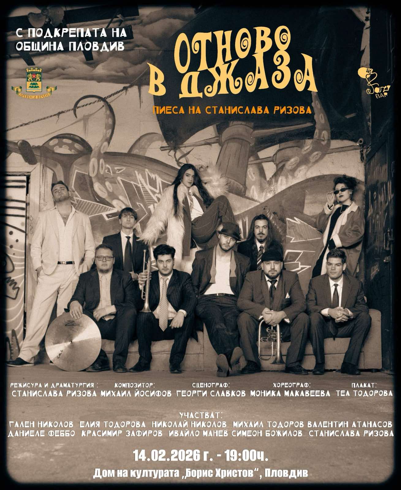 69 Февруари винаги носи със себе си особен аромат на споделеност, а датата 14-и отдавна се е превърнала в символ на най-чистите човешки чувства. Свети Валентин е денят, в който избираме да празнуваме обичта във всичките ѝ форми – към любимия човек, към изкуството и към онези мигове, които ни карат да се чувстваме истински живи. Какъв по-хубав начин да отбележим този празник от това да се потопим в ритъма на джаза, където страстта и импровизацията вървят ръка за ръка? Тази година Пловдив ще посрещне празника по един наистина различен начин. На 14 февруари 2026 г. в 19.00 часа, сцената на Дом на културата „Борис Христов“ ще се превърне в пространство, където границите между реалност и изкуство изчезват. Пловдивската публика ще стане свидетел на „Отново в джаза“ – смел творчески експеримент, в който музикантите оставят партитурите, за да се превърнат в актьори. Спектакълът ни пренася в света на бенда на Розалия Ставрева. Това е разказ за група таланти, обединени от една на пръв поглед недостижима мечта. През призмата на хумора, нежната самоирония и щипка меланхолия, артистите разкриват лицата зад инструментите. Това е история за фалшивите надежди, за силата на приятелството и за онзи вечен копнеж по свободата, който само джазът може да даде. Докато се лутат между репетициите и житейските компромиси, героите ни карат да се запитаме: колко далеч можем да стигнем в преследването на мечтите си и колко близо е всъщност тромпетът на Майлс Дейвис? В центъра на действието е обичаната пловдивска певица Елия Тодорова, която застава редом до актьора Николай Николов. Магията се допълва от музиката на Михаил Йосифов и визията на режисьора Станислава Ризова. На сцената ще чуем и видим на живо бенд в състав: Гален Николов, Красимир Зафиров, Ивайло Манев, Михаил Тодоров, Даниеле Феббо, Валентин Атанасов и Симеон Божилов. Динамиката на спектакъла е подчертана от хореографията на Моника Макавеева. Празничната емоция няма да приключи с последната завеса. С подкрепата на Община Пловдив, вечерта ще продължи с ексклузивен коктейл във фоайето на Дома на културата. Там, в непринудена атмосфера, публиката ще има рядката възможност да се срещне лично с артистите и да се наслади на още популярни джаз пиеси, изпълнени на живо. „Отново в джаза“ не е просто постановка – това е искрена и човешка изповед, разказана с много любов. Една покана да преживеете Свети Валентин по пловдивски: с класа, стил и много музика. Можете да закупите своите билети онлайн в мрежата на Eventim, както и на касите в цялата страна. Може да ви хареса също XXIX фестивал „Златен ритон“ започва утре с прожекция на два пловдивски филма Ансамбъл „Тракия“ подари на публиката своята „Коледна приказка“ Хор „Евмолпея“ със самостоятелен юбилеен концерт „Гласът на Коледа“ в Малката базилика Мост от цветове: 60 творци от България и Турция се срещат „Под седемте тепета“