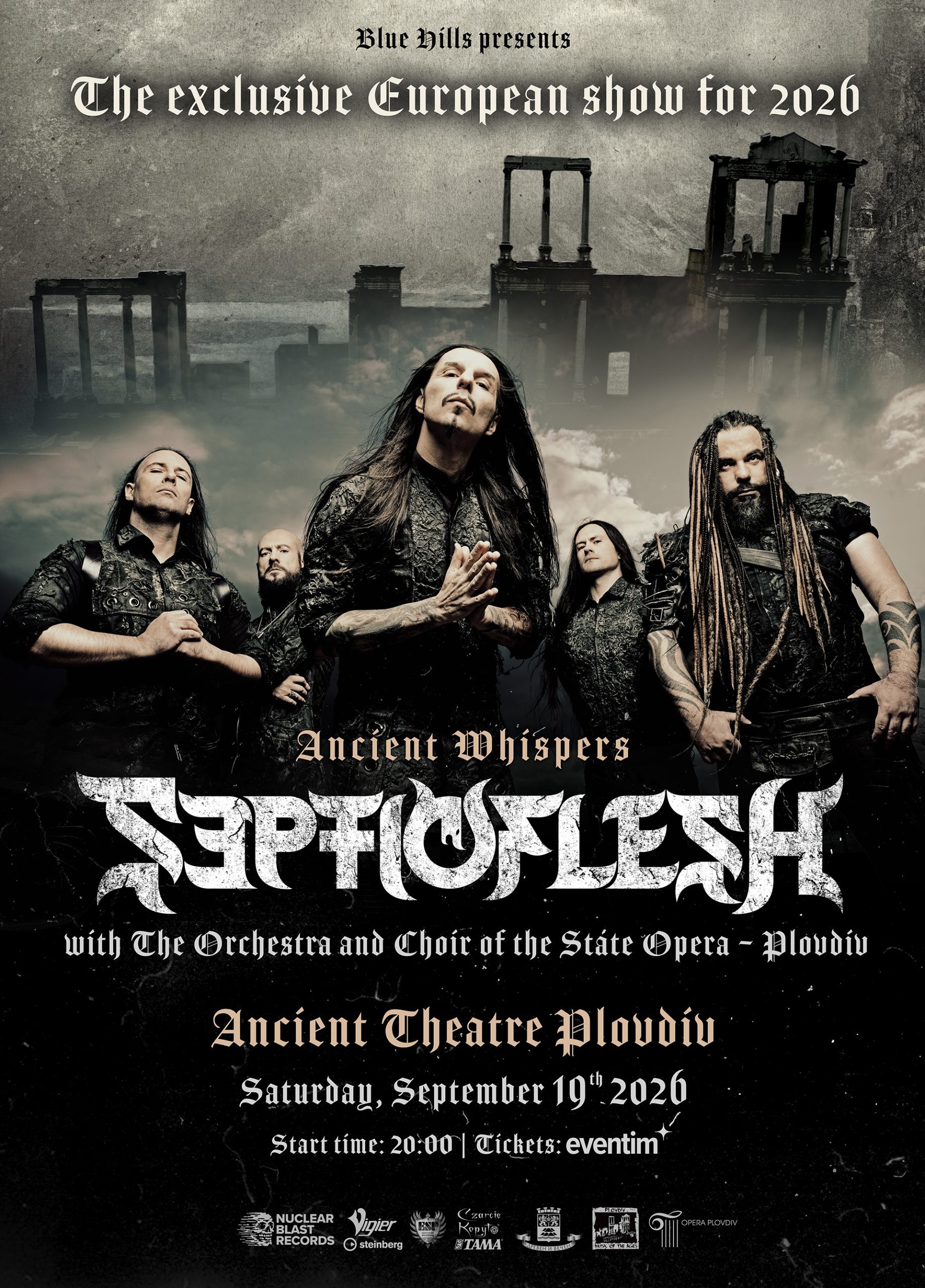 645 На 19 септември 2026 г. (събота) в Античен театър, Septicflesh ще изнесат ексклузивно мащабно шоу с оркестър и хор на Опера Пловдив! В топлата многовековна прегръдка на античната обител в историята на световния екстремен метъл ще бъде записана главата „Ancient Whispers“, подписана от Septicflesh и промотирана от Blue Hills. Година след преминалите с огромен успех напълно разпродадени два последователни концерта на Septicflesh в родната им Атина, в одеона на Ирод Атик – познат и като Иродион, древен одеон от времето на Римската империя в подножието на Акропола с капацитет около 5 000 зрители – групата пренася този грандиозен спектакъл в също толкова магичната атмосфера на Античния театър в Пловдив. Античният театър на Филипополис в Пловдив е един от най-добре запазените древноримски театри в света, датиращ от края на I век сл. Хр., и до днес функционира като активен културен обект за представления и концерти. И така, България ще е третата държава в света, която ще има привилегията да е домакин на зрелищното представление, което групата ще изнесе съвместно с оркестър и хор на Опера Пловдив! Подобен тип концерти винаги са нещо специално и този обещава да е точно такъв. Нещо повече – това ще е единственият симфоничен концерт на Septicflesh за 2026 г.! Също така, ако има метъл формация, която да знае как се правят аранжименти на метъл парчета за изпълнение с класически оркестър, то това несъмнено са именно Septicflesh. Ако смятате, че оркестрациите, които групата записва в студио с истински симфоничен оркестър още в процеса на създаване на своите албуми, са трудни за пресъздаване на живо – напълно сте прави. Допълнителен ключов детайл, който не просто придава допълнителна тежест на събитието, но и допълва неговата уникалност – партитурите! Партитурите за оркестъра ще са дело на китриста на бандата „маестро“ Christos Antoniou, който е дипломиран композитор на класическа музика с отличия от London College of Music. А пък визията за плаката за шоуто, на което групата лично даде заглавието „Ancient Whispers“, е дело на фронтмена – вокалист и басист на SF – Spiros Antoniou с артистичен псевдоним Seth Siro Anton. Чрез нея той дава изява на още едно свое творческо амплоа – художникът Seth. Той е отговорен за визуалната естетика на групата и е автор на артуърка за издания на изпълнители като Nile, Paradise Lost, Exodus и много други… Той е и автор на въздействащото оформление на постера за този концерт! Без съмнение това представление ще бъде ексклузивно, а изборът на България за място на едва седмия пореден концерт от този тип в дългогодишната история на Septicflesh – редом с родната Гърция и далечно Мексико – е повод за основателна гордост. Събитието на 19-и септември ще е едно от онези, които бележат поредния ключов етап в кариерата на Septciflesh и в частност е нещо важно в концертния живот на страната ни, което да обърне погледите на фенове от чужбина и специализирани медии по света към нашите територии. Момчетата споделят, че този концерт ще е основен акцент в концертната им програма за цялата 2026-та и биха искали да поканят всеки един фен не само от Европа, но и от всички краища на света. Това, разбира се, няма да е първото гостуване на бандата у нас, но е първото, на което те ще изпълнят музиката си в партньорство с елитния Пловдивски филхармоничен оркестър. Освен че е от съществено значение за кариерата на групата, събитието показва, че България може д