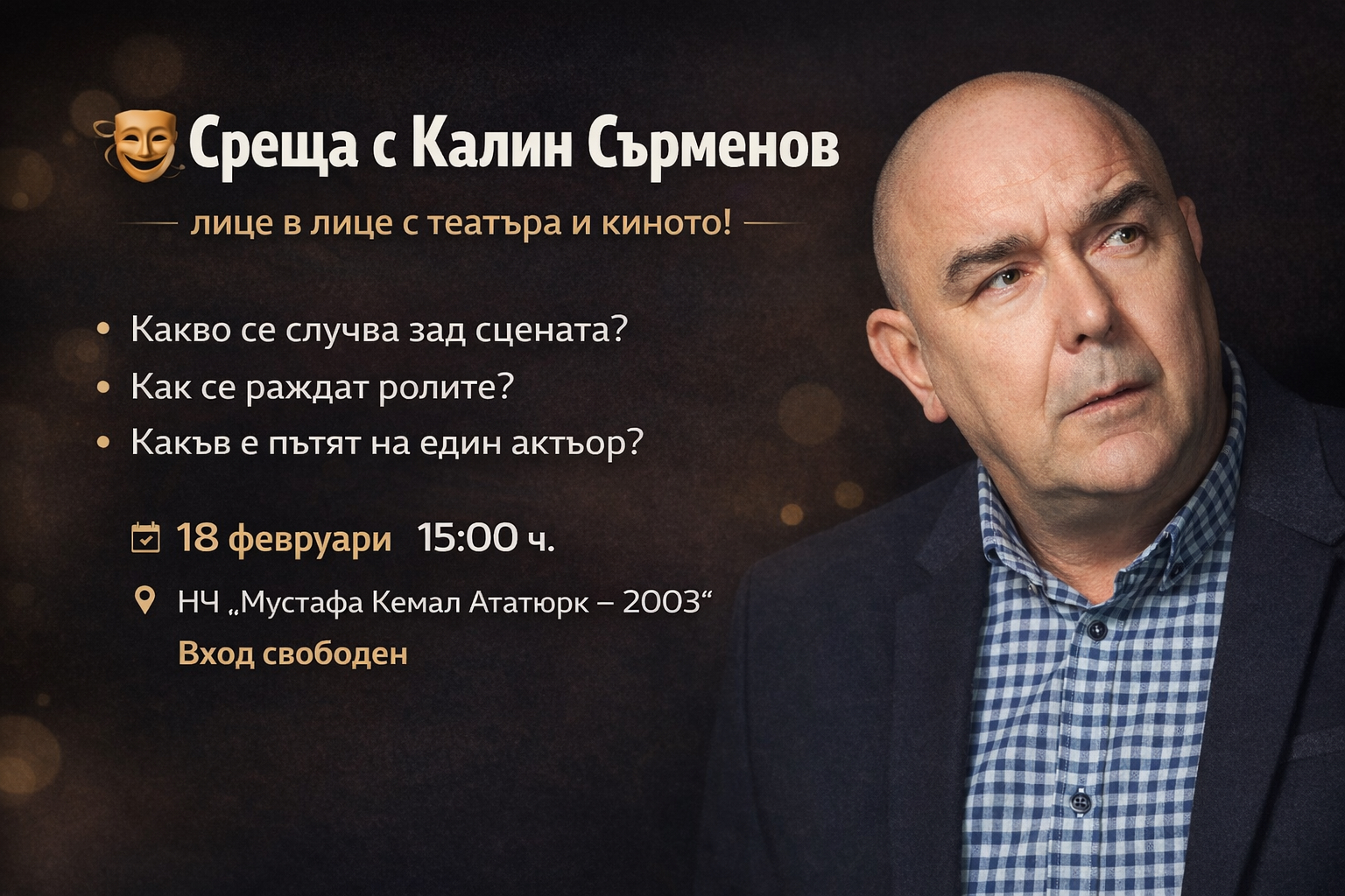 300 Народно читалище „Мустафа Кемал Ататюрк – 2003“ в Пловдив се превръща в пресечна точка на класическото театрално изкуство и модерните технологии, канейки гражданите на едно по-различно културно изживяване. На 18 февруари от 15:00 часа салонът на читалището ще се изпълни с духа на Мелпомена за една специална и непринудена среща с един от най-харизматичните български актьори – Калин Сърменов. В уютна и вдъхновяваща атмосфера гостите ще имат привилегията да надникнат зад кулисите на голямата сцена, да чуят лични истории за творческия път и да разговарят за магията на киното и театъра с човек, чието присъствие винаги оставя следа. Калин Сърменов, познат на публиката не само със знаковите си роли на екрана и сцената, но и като визионер в управлението на културни институции, е сред творците, които умеят да провокират и вдъхновяват едновременно. Със своя богат опит като директор на Сатиричния театър „Алеко Константинов“ и неподражаемия си стил, той внася в разговорите една особена динамика и дълбочина, превръщайки всяка среща в истински урок по естетика и професионализъм. Входът за събитието е свободен, а поканата е отворена към всеки, който иска да се докосне до опита на един голям артист. Паралелно с грижата за духовността, читалището прави и своята голяма крачка към бъдещето с официалното откриване на нов Дигитален клуб. Създаден по Националния план за възстановяване и устойчивост и финансиран от Европейския съюз – NextGenerationEU, този център вече предлага на малки и големи пловдивчани безплатен достъп до най-съвременно компютърно оборудване. Период на проекта: 01.11.2025 – 30.06.2027 г., стойност на финансирането: 50 000 лв. Проектът има за цел да заличи границите пред знанието, предоставяйки ресурси за дигитално обучение, онлайн платформи и развитие на компютърни умения за всички поколения. Всеки делничен ден вратите на клуба са отворени за тези, които вярват, че ученето е процес за цял живот и че технологиите трябва да бъдат достъпни за всеки. Може да ви хареса също AL BANO: Да пея на сцена като Античния театър в Пловдив е чест и вдъхновение Ансамбъл „Тракия“ с нов мащабен спектакъл, вдъхновен от река Марица България с пълен национален отбор за Европейското първенство по стрелба с лък в Пловдив Регионален етнографски музей – Пловдив с работилници за мартеници