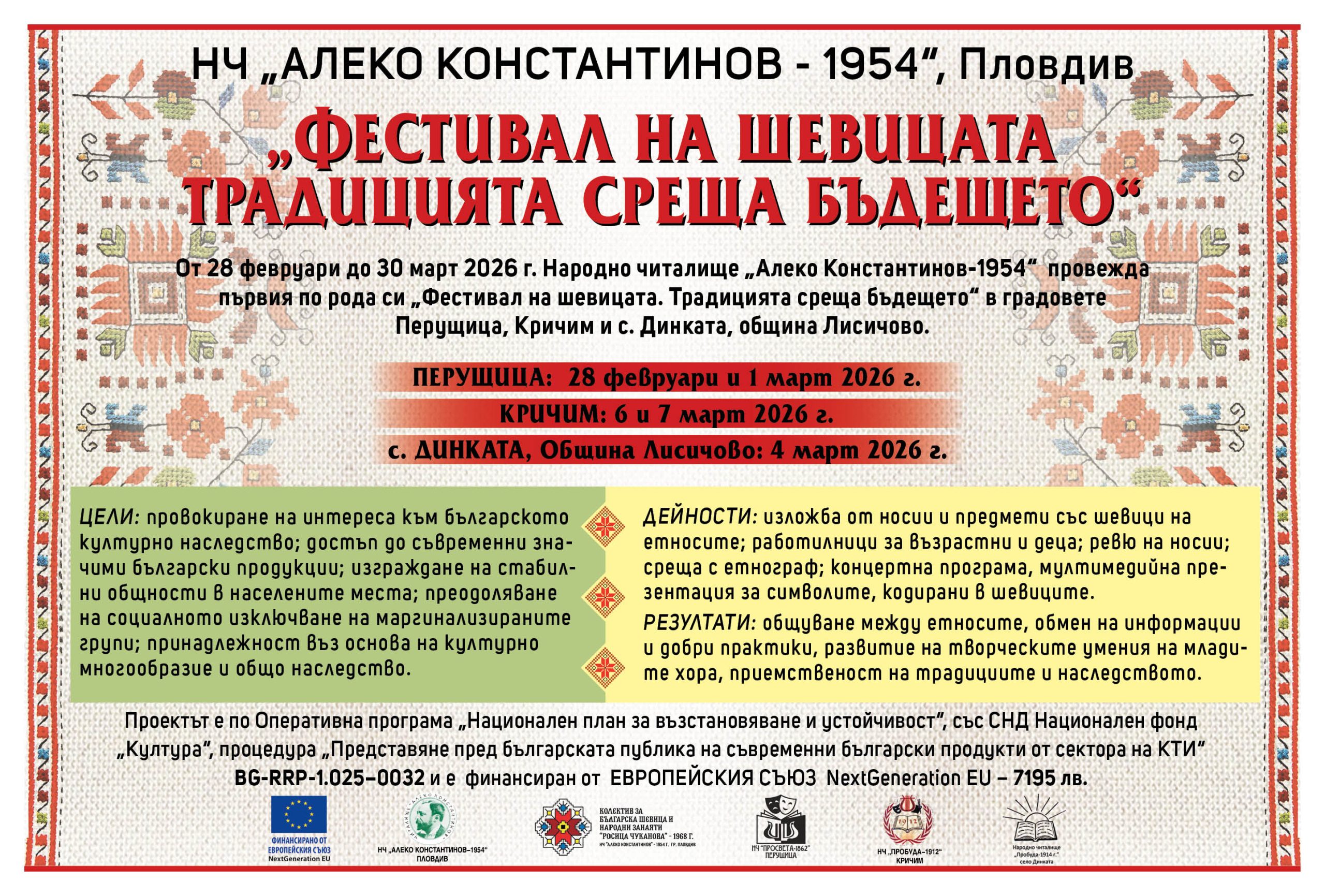 25 От 28 февруари до 30 март 2026 г. Народно читалище „Алеко Константинов-1954“ организира първия по рода си „Фестивал на шевицата. Традицията среща бъдещето“ в градовете Перущица, Кричим и с. Динката, община Лесичово. Проектът се реализира по ОП „Национален план за възстановяване и устойчивост“, със СНД Национален фонд „Култура“, процедура „Представяне пред българската публика на съвременни български продукти от сектора на КТИ“ BG-RRP-1.025 –0032 и е финансиран от ЕС NextGeneration EU. На 28 февруари и 1 март 2026 г. фестивалът ще се проведе в НЧ „Просвета-1862“, гр. Перущица, на 4 март 2026 г.в НЧ „Пробуда – 1914“ с. Динката, община Лесичово, на 6 и 7 март 2026 г.в НЧ „Пробуда-1912“, гр. Кричим. Екипът на НЧ „Алеко Константинов-1954“ Пловдив предлага на жителите и гостите на населените места разнообразни развлечения, в които могат да участват. Залите на читалището ще се превърнат в творчески ателиета. В програмата на фестивала са включени: Изложба „Шевицата на етносите в България – българи, арменци, турци, роми“, която представя национални костюми, везба и тъкани от частни колекции и съвременни предмети от бита и облекла, изработени от везбарките на Колектива за везба и занаяти „Росица Чуканова-1968 г.“ към читалището – тишлайфери, пана, карета, кенета, съвременни облекла, в извезването на които са използвани орнаменти от автентични шевици. Прожекция „Памет за утре“ – мултимедийна презентация от стари, уникални снимки с носии от началото на XX в. Снимките са от семейните архиви на фамилии от Пловдив и Южен район. Везбарките от Колектива за българска шевица и народни занаяти „Росица Чуканова-1968 г.“ ще проведат „Работилници за изработка на шевици“ за възрастни и деца. Те са отворени за всички, които желаят да се научат да бродират – деца, родителите им, посетители. В работилниците за възрастни майсторките ще демонстрират уменията си в изработването на везба и ще показват и обучават желаещите в тънкостите на занаята. Всеки посетител може да провокира уменията си под ръководството на Виолета Чалъкова – член на Задругата на майсторите на народни художествени занаяти, Йорданка Бояджиева, Анна Драганова, Мария Ангелова, Веселина Кумчева, Виктория Недевска др. Везбарките ще демонстрират изработката на шевицата. Всички обучени получават занаятчийско свидетелство „Майстор за един ден“. В Работилничките за деца малчуганите ще оцветяват схеми с шевици, ще рисуват картички, редят пъзели от шевици и др. игри и занимания. Посетителите ще се насладят на Ревю от автентични национални носии от етнографските области на България. Дефилето ще представи 10 автентични народни носии, изработени преди повече от един век. Каним всички, които имат народна носия, да се включат в проявата и да станат част от уникалното ревю. Инж. Мария Ангелова ще представи шевиците от Тракийския етнографски район с Мултимедийна презентация „Символите, кодирани в шевиците“ – една от най-интересните теми, свързани със шевиците – интересен подход за запознаване с културното наследство и традициите. Богата концертна програма под надслов „Кръшно се хоро завило“, в която ще се включат изпълнители от съставите на читалищата. И едно предизвикателство към публиката – призоваваме посетителите да са облечени в носии и дрехи, в които има елементи от български шевици – тениски, шалове и др., за да се потопим