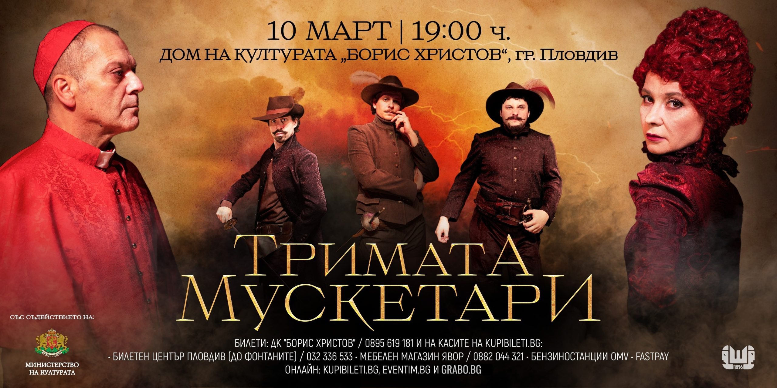 256 На 10 март 2026 от 19:00 часа сцената на Дом на културата „Борис Христов“ ще се превърне в арена на чест, приятелство и безстрашие. Драматично-куклен театър „Васил Друмев“ – Шумен гостува в Пловдив със спектакъла „Тримата мускетари“ по Александър Дюма – мащабна, динамична и въздействаща театрална адаптация на една от най-обичаните класики в световната литература. Историята проследява пътя на младия Д’Артанян, който мечтае да стане герой, присъединявайки се към мускетарите на крал Луи XIII. Но зад блясъка на кралския двор се крият интриги, борби за власт и предателства. В тази опасна и напрегната среда Д’Артанян обединява сили с Атос, Портос и Арамис, за да се изправи срещу кардинал Ришельо и коварната Милейди де Уинтър. Постепенно младият герой осъзнава, че истинската смелост не се измерва само с шпагата, а приятелството и любовта имат много по-дълбока стойност. Спектакълът предлага зрелищни бойни сцени, впечатляваща сценография и съвременно звучене, което прави класическата история актуална и днес – във време, което отново търси своите герои. В ролите ще видим Димитър Баненкин, Мая Бежанска), Нено Койнарски, Димитрия Милушева, Борислав Вълов – Ей Бо, Антония Гюруди, Калин Пачеръзки, Росен Караджов, Веселин Бърборков, Светлин Иванов, Нелли Таукчи, Петър Андреев, Валентин Ченков, Силвия Донева, Ванеса Пеянкова, Ерато Николова и Стефан Мараджиев. Драматургичната адаптация е дело на Христо Раянов, а режисьор на постановката е Ивайло Ненов. Сценографията е поверена на Ванина Цандева, музиката е на Димитър Косев и Васил Маринов, а хореографията и сценичният бой са дело на Александър Манджуков. На 10 март Пловдив ще стане свидетел на една история за вярност, чест и безусловна отдаденост – защото „Един за всички, всички за един“ продължава да звучи актуално и днес. Билети могат да бъдат закупени на касата на Дом на културата „Борис Христов“, както и в мрежата на kupibileti.bg – https://www.kupibileti.bg/bg/about-event/1841, Грабо -https://grabo.bg/0rhkz и Eventim, включително в Билетен център Пловдив. Проектът се реализира с подкрепата на Министерството на културата. Може да ви хареса също Мигове на съзерцание: Емилия Арабаджиева открива изложба в галерия „Възраждане“ Белите гиганти на Павел Койчев завземат утре Пловдив ДПХ кани на традиционната изложба „Дами канят“ 2026 Нови артистични умения, два квартални фестивала и концерт на Панайот Панайотов в четвъртото издание на проекта „60+“ в Пловдив