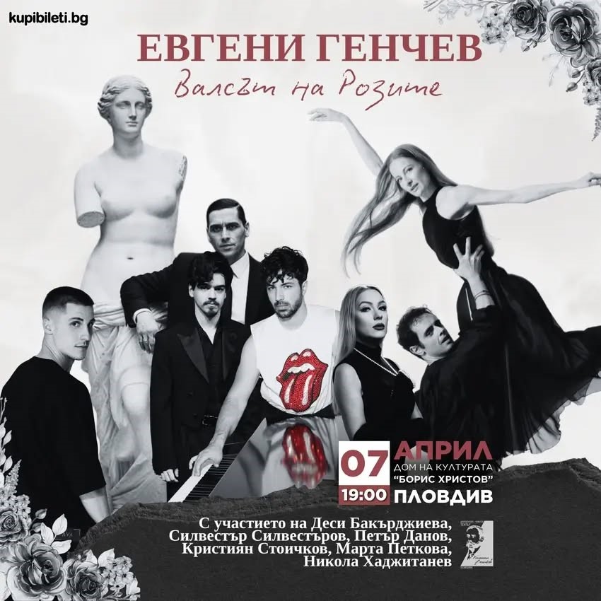 204 Пловдив се готви за една незабравима вечер, в която класиката среща модерното изкуство. На 07 април 2026 г. в 19.00 часа, сцената на Дом на културата „Борис Христов“ ще се превърне в пространство на чиста емоция и виртуозност. Концертът „Валсът на розите“ не е просто музикално събитие – това е спектакъл за сетивата, който обещава да остави следа в сърцето на всеки присъстващ. Централна фигура в този магичен свят е виртуозният пианист Евгени Генчев. Израснал в Пловдив и възпитаник на престижната Кралска музикална академия в Лондон, Евгени отдавна е надскочил границите на България. Свирил е на няколко континента – от „Алианц Арена“ в Мюнхен до мащабни сцени в Китай и САЩ. Евгени Генчев е известен със способността си да преплита класическата прецизност с модерен, почти кинематографичен размах. Неговото свирене не е просто техника, а разказване на истории. Носител на над 15 международни награди за пиано, той успява да направи класическата музика достъпна и вълнуваща за млади и стари, превръщайки се в истински посланик на изкуството в 21-ви век. Спектакълът включва още популярни имена от българската културна сцена. Обичаните актьори Деси Бакърджиева и Силвестър Силвестров, заедно с Петър Данов и Кристиян Стоичков, ще внесат драматургична дълбочина и жива енергия в „Валсът на розите“. Тяхното участие превръща концерта в театрално-музикално преживяване. Специално за вечерта към състава се присъединяват примабалерината Марта Петкова и премиер-солистът Никола Хаджитанев. Двете най-ярки звезди на Софийската опера и балет ще придадат ефирност и визуално съвършенство, превръщайки звуците на пианото в изящно движение. Програмата е внимателно подбрана, за да предложи синтез от най-великите класически произведения, пречупени през нов, вълнуващ прочит. Очаквайте „нещо повече“ от стандартен концерт – очаквайте импровизация, страст и изненади, които ще размият границата между изпълнител и публика. Билети се продават в мрежите на kupibileti.bg и Eventim.BG Организатор е „Недеков АРТ“ ООД Може да ви хареса също Изложба „Настроения“: Даниела Стоянова и Никола Певичаров – живопис, графика и рисунки София филм фест в Пловдив отново с филми от най-големите световни фестивали Млади музиканти представят „Магията на музиката – истории по ноти“ в пловдивските училища Спектакъл и филм връщат спомена за Леда Тасева