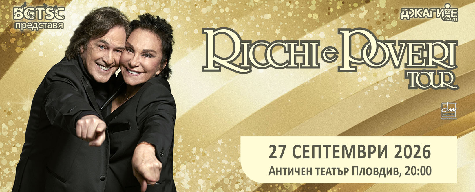 20 Античният театър ще посрещне RICCHI E POVERI в Пловдив! Историческият първи концерт на италианските музикални легенди и любимци на няколко поколения меломани ще се състои на 27 септември тази година от 20:00 часа. Изпълнителите на мегахитовете „Sarà perche ti amo“, „Che sarà“,“Made in Italy“, “Se m’innamoro“, “Mamma Maria”, “La prima cosa bella”, “Voulez-vous danser”, „Ma non tutto la vita“ и много други, печелят неведнъж награди на фестивала „Санремо“ и са най-често присъстващите в световните музикални класации италиански изпълнители. Билети за специалния концерт ще се продават от 10:00 часа на 03 април, петък онлайн и в мрежата на Еventim.bg. Някои от местата, от които могат да бъдат закупени са: билетна каса на Борис Христов в гр.Пловдив, бензиностанции OMV, магазини На тъмно, Office 1 Superstore, Технополис, касите на Български Пощи и други. Суперзвездите RICCHI E POVERI идват придружени от маестро Алфредо Биондо на клавишни, Антонио Ругиеро на китари, Роберто Чиапета на бас и Джанпаоло Ноче на барабани. RICCHI E POVERI са най-популярната световно призната италианска група. С над 30 милиона продадени записа и 30 издадени албума, те се превърнаха в култов културен феномен, печелейки голяма популярност сред всички възрастови групи. През 2024 година за изненада на всички. „Ma non tutta la vita“ влезе в Топ 10 в Италия в Spotify, Amazon Music и iTunes, потвърждавайки, че е сред най-слушаните песни в Италия на всички основни дигитални платформи с общо над 50 милиона слушания само в Италия. След като многократно надхвърлиха прага от 8 милиона месечни слушатели в Spotify, те се оказват артистите с най-много месечни слушатели на платформата сред участвалите в 74-ия фестивал в Санремо. Клипът влезе в Топ 10 на най-гледаните видеоклипове в YouTube в раздел Музика и във VEVO с милиони гледания. В TikTok песента стана вирусна до степен да бъде една от най-популярните песен в Италия за повече от две седмици с повече от 340 хиляди творения и 630 милиона гледания. Преживейте невероятни моменти и си подарете много настроение заедно с RICCHI E POVERI и вечните им хитове! 27 септември, Античен театър на град Пловдив! Деца до 6 годишна възраст (вкл.) влизат без билет, но без право на място. Деца от 7 до 16 годишна възраст ползват 50% намаление. Всички лица до 18 годишна възраст влизат само с придружител с билет и попълнена декларация, която може да изтеглите от тук: https://vionyx.eu/minors-declaration . BGTSC е член на Сдружение Сцена музика СНЦ и спазва Етичния кодекс за дейността на организаторите на концерти в България! Може да ви хареса също Станко Абаджич представя поетичното лице на фотографията в „Огледало на живота“ Възродено наследство – изложба по повод 70 години АИР „Старинен Пловдив“ Награденият в Кан „Звукът от падането“ и „Най-лошата личност на света“ в събота на София филм фест в Пловдив Фенове от 37 държави пристигат за Septicflesh и Опера Пловдив