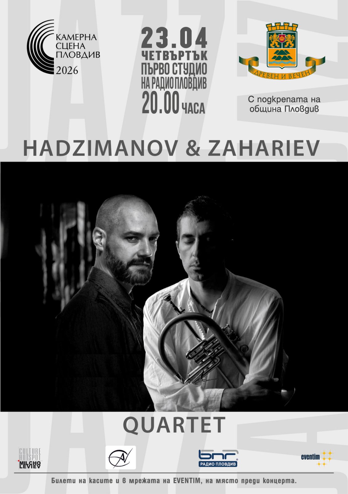 15 На 23 април 2026 г., четвъртък, от 20:00 часа, в Първо студио на Радио Пловдив, „Камерна сцена Пловдив“ представя „Хаджиманов & Захариев Квартет“. „Хаджиманов & Захариев Квартет“ е естествено продължение на колаборация, която започва преди 20 години в далечната 2006-а, когато Росен Захариев е поканен за няколко звукозаписни сесии в третия албум на „Васил Хаджиманов бенд“. Първата среща на артистите обаче датира от края на 90-те на Източното крайбрежие на Съединените щати, Бостън – Масачузетс, където заедно споделят време като студенти в престижния Berklee College of Music. Днес Хаджиманов и Захариев са водещи имена на съвременната мултижанрова сцена не само на Балканите. Техният висок професионализъм и новаторски дух им отреждат място сред най-уважаваните инструменталисти в Европа, разпознаваеми със своя уникален почерк и безупречна техника. Отпечатъкът на изминалото време от последните срещи между музикантите е емоционалният бустер за нова среща на сцената и обмяна на нова креативна енергия. Квартетът се ползва с широка международна известност, базирана на десетилетия присъствие по световните джаз форуми и множество престижни награди. Съставът е изграден от солидни артисти, опитни изследователи на пространството на звука и тишината: • Росен Захариев – тромпет, перкусии; • Васил Хаджиманов – пиано, кийборд; • Мирослав Товирач – бас; • Борислав Петров – барабани. Музиката им е комбинация от авторски композиции и импровизации, които се проявяват като естествен емоционален отпечатък на конкретния момент, място и публика. Виртуозността на изпълнителите превръща всеки техен концерт в бутиково събитие, което гарантира най-високо ниво на музикално преживяване. „Камерна сцена Пловдив“ се осъществява с подкрепата на община Пловдив и е част от Културния календар на града за 2026 година. Билети се продават в мрежата на EVENTIM, както и на място преди концерта. Може да ви хареса също Изумителният огнен спектакъл „Изкушение“ гостува в три пловдивски района София филм фест в Пловдив приключва с Вим Вендерс и документален филм за Оруел На София филм фест в Пловдив днес: „Палестина 36“ с Джереми Айрънс и „Рицари на справедливостта“ с Мадс Микелсен Детският кинофестивал се завръща в Пловдив с 16 безплатни прожекции
