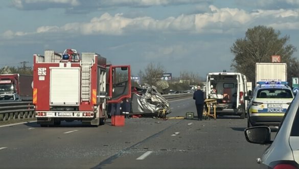 14 Тежка катастрофа стана на автомагистрала „Тракия”. На място има полиция, пожарна и линейка. Кола е премазана на 2 км в посока Бургас – на излизане от София. Движението в участъка се осъществява само в аварийна лента и се пренасочва по обходен маршрут – по път I-6 София – Бургас. Трафикът се регулира от „Пътна полиция“. Може да ви хареса също При преследване мъж без книжка блъсна полицейски автомобил в района на Суворово Шофьорът на автобус, сътворил зрелищното меле, е дал положителна проба за бензодиазепин През изминалото денонощие са потушени 46 пожара в страната, един е загинал Пострадали са двама души при гръмотевична буря на връх Ком, единият е загинал