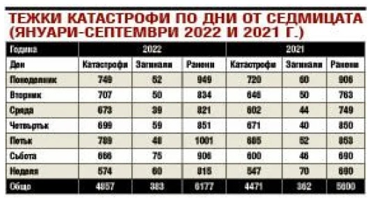 158 От 17 до 18 часа – през тези 60 минути по българските пътища стават най-много катастрофи с ранени и загинали. Това сочи статистиката на КАТ. 390 тежки пътнотранспортни произшествия са регистрирани в този час за периода от януари до септември 2022 година. Подобен е и резултатът за същия период на 2021 година, когато броят на катастрофите във “фаталния час” е бил 371. За сравнение – най-безопасният час за шофиране е между 3 и 4 часа през нощта, когато за 9-те месеца на 2022 г. е имало 34 катастрофи, а през 2021 – 36, с повече от 10 пъти по-малко, отколкото между 17 и 18 часа, пише „Труд“. Със 789 тежки катастрофи петък е бил най-опасният ден от седмицата в периода от януари до септември тази година. Но не е голяма разликата с понеделник, когато катастрофите са били 749. През 9-те месеца на миналата 2021 година позициите са разменени – понеделник води със 720 катастрофи, докато петък е втори с 685. Най-безопасни и през тази, и през миналата година са били неделите – 574 пътни произшествия за 2022 г. и 547 за 2021 г. По брой на тежките катастрофи на най-опасните области в България са Пловдив и София град – там, където и трафикът е най-натоварен заради по-големия брой население и засилената икономическа активност. За първите 9 месеца на 2022 г. черната класация се води от пловдивчани, а софиянци са втори, докато за същия период на 2021 г. е обратното. Топ 5 на опасните области се допълва от Бургас, Плевен, Русе, Велико Търново и София област. Обяснението за това на експертите по пътна безопасност е, че оттам минават важни транспортни коридори, между Турция, Гърция и Румъния пътуват цели кервани от ТИР-ове, които пътищата често не могат да поемат, какъвто е случаят най-вече с отсечката Русе-Бяла-Велико Търново. Но ако класацията се прави спрямо броя на жителите на съответните области, тя ще бъде оглавяване не от София, Пловдив или Бургас, а от Плевен, Ловеч или Видин, уточняват специалистите. България отново води в черната класация на Европа 520 загинали три дни преди края на годината България и за 2022 г. се очертава като водеща по жертви на катастрофи сред страните в Европейския съюз. Към 28 декември – три дни преди края на годината, загиналите вече са 520 души, което прави към 78 убити на 1 милион от населението. През 2021 г. загиналите при катастрофи в България бяха 561 души, което също се изчисляваше на 78 от 1 милион население, тъй като тогава се работеше с прогнозни, а не с реални данни от преброяването. Очертава се отново да сме на второ място след Румъния, където трайно загиналите при катастрофи годишно са между 80 и 90 на 1 милион от населението. Убитите по пътищата в нашите две балкански държави са двойно повече от средните стойности за ЕС, които са между 40 и 50 жертви на 1 милион жители. 15 души са убитите по пътищата у нас само за почивните дни около Коледа – от 23 до 28 декември включително. През 2021 г. за същите дни жертвите бяха 6, показват данните на КАТ. Може да ви хареса също Полицейски части щурмуваха Монтанско в поредна акция срещу изборните измами, има задържани Специализирана акция в Монтана срещу купуване на гласове и престъпления преди изборите Българин бе осъден на затвор за опит за изнасилване на непълнолетна във Великобритания Автобус от градския транспорт се запали на централен булевард в Пловдив