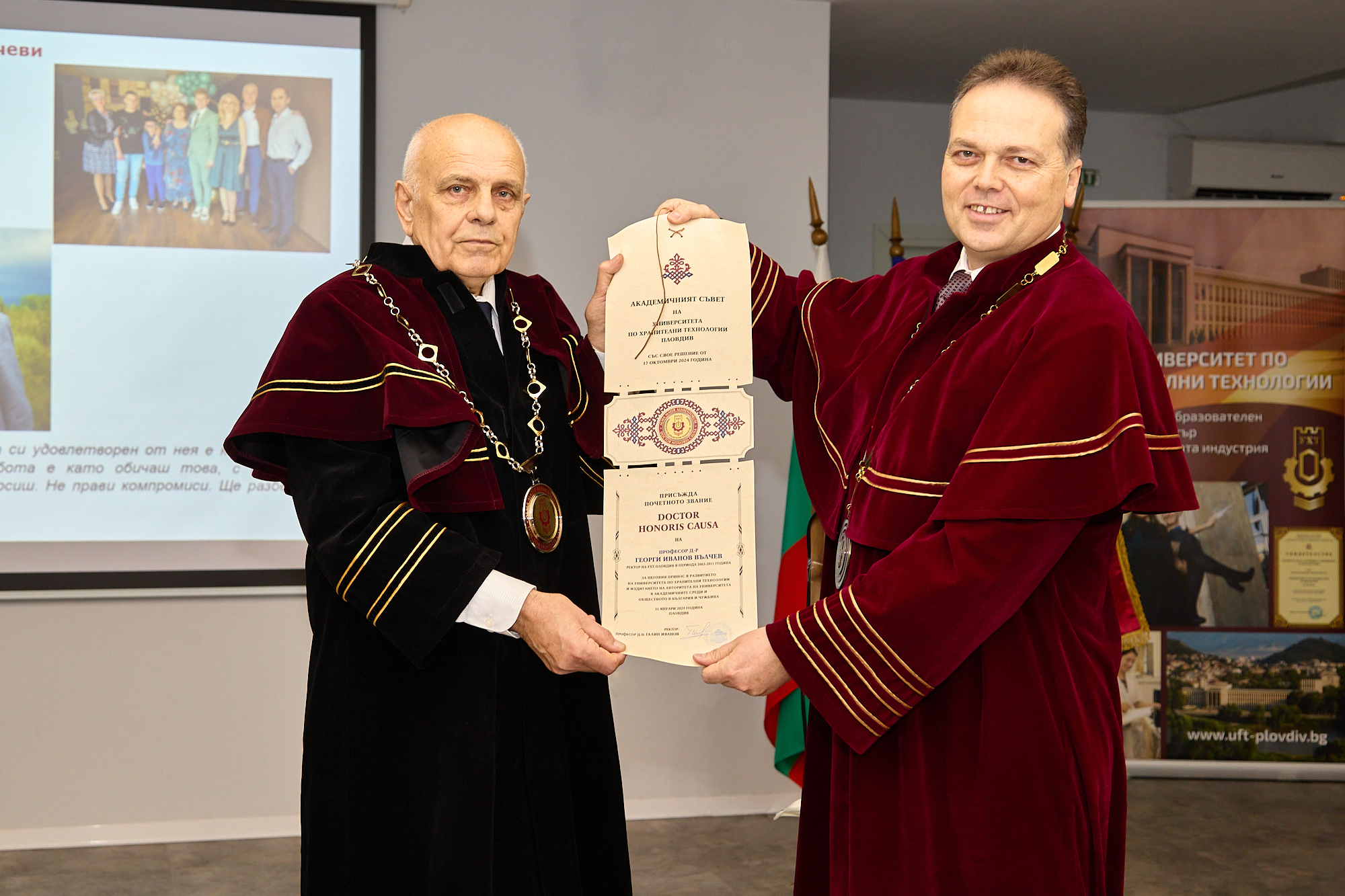 128 Проф. Георги Вълчев беше удостоен с почетното звание „Доктор хонорис кауза“ на УХТ. Това стана на тържествена церемония в зала „Хоризонт“ на висшето училище. „За нас и изключителна чест да извършим удостояването с почетната титла „Доктор хонорис кауза“ на проф. Георги Вълчевq ректор на УХТ в периода 2003-2011 г. Убедени сме, че това е напълно заслужено признание за неговия принос в развитието и издигането авторитета на Университета в академичните среди и обществото в България, както и за неговата професионална и обществена дейност“, заяви ректорът на висшето училище проф. Галин Иванов. Решението е на Академичният съвет на УХТ от 17 октомври 2024 година. Проф. Станислава Ташева, ръководител катедра „Промишлена топлотехника“, представи от името на Инициативния комитет номинацията на проф. Георги Вълчев. „Доктор хонорис кауза на УХТ Пловдив“ се присъжда , като признание за неговия професионален и академичен принос за издигане престижа и авторитета на Университета по хранителни технологии“, тя. Проф. д-р инж. Георги Вълчев е ръководител на катедра „Промишлена топлотехника” в периода 1993 – 1999 г. Той е Декан на Технически факултет в годините 1999 – 2003, а от ноември 2003 до 2011 г. е ректор на УХТ – Пловдив. Роден е на 07.02.1945 г. в с. Свобода, Хасковска област. Средно образование завършва през 1965 г. в Техникума по енергетика „Вилхем Пик” – София, сега Професионална гимназия по транспорт и енергетика “Хенри Форд”, специалност „Топлинна и хладилна техника“. През 1967 г. постъпва на работа като хладилен техник в ЦМБ – Стара Загора. От 1969 г. е редовен студент във ВМЕИ-София в Енергомашиностроителния факултет, специалност „Промишлена топлотехника“. От 1974 г. е хоноруван асистент по топлотехника във ВИХВП, а от 1975 г. е избран за редовен асистент по Техническа термодинамика. Защитава докторска дисертация през 1984 г., а от 1989 г. е избран за редовен доцент по Термодинамика. От 2006 г. е избран за професор с хабилитационен труд „Повишаване на енергийната и екологичната ефективност в хранително-вкусовата промишленост”. Специализирал е в Московския енергетически институт. Проф. д-р инж. Георги Вълчев работи в областта на промишлената топлотехника и енергийната ефективност, като има над 180 научни статии. Автор е на учебник и ръководство по дисциплината, която извежда, както и на 4 изобретения. Ръководител и лектор е в курсовете по „Обследване за енергийна ефективност на сгради и промишлени системи”. Член е на различни професионални и научни организации и съюзи: Асоциацията на енергийните инженери – България; Българско общество на инженерите по отоплителна, климатична и хладилна техника; Експертен съвет по устройство на територията на Международен панаир Пловдив ЕАД по отоплителна, хладилна и климатична техника; член и заместник-председател на Специализирания научен съвет на ВАК по „Енергийна технология и машини“ към ТУ – София; член на научния съвет към УХТ по „Технология на млякото и млечните продукти”; член на научния консултативен съвет към Министъра на земеделието и храните; член на управителния съвет на Националния център по аграрни науки; на Управителния съвет на Селскостопанската академия; на консултативния съвет към кмета на гр. Пловдив и председател на комисия по „Наука и образование”. Проф. д-р инж. Георги Вълчев е удостоен с почетното зва