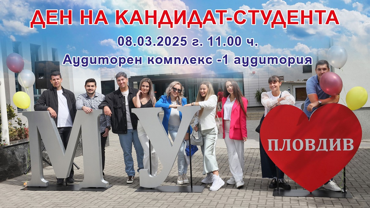 231 Ден на кандидат-студента в МУ-Пловдив ще се състои на 8. март 2025 г. от 11 часа в първа аудитория на Аудиторния комплекс. Кандидат-студентите, техните родители и близки ще могат да получат актуална информация относно протичането на изпитите, регистрацията, съдържанието и сроковете за класиране и записване. Ще присъстват представители на ръководството на Медицински университет – Пловдив, председателите на изпитните комисии и експерти от отдел „Учебни дейности“, които ще отговарят на зададените въпроси. Желаещите могат да се включат и онлайн в платформата Zoom (https://zoom.us/j/92762717905?pwd=Hm3U8lua1asTaNwiZH2zdHWjPyASoE.1 Код за достъп до линка : 937103 ) В деня на събитието в книжарницата на МУ-Пловдив ще може да се закупи новият кандидатстудентски справочник. Може да ви хареса също Здравният министър: Благодарение на ваксините всяка минута се спасяват човешки животи Киселова: Сарафов заема формално длъжността главен прокурор, без да издава актове Случаите на морбили у нас са вече 149 Над 5% от българите страдат от депресия или тревожност