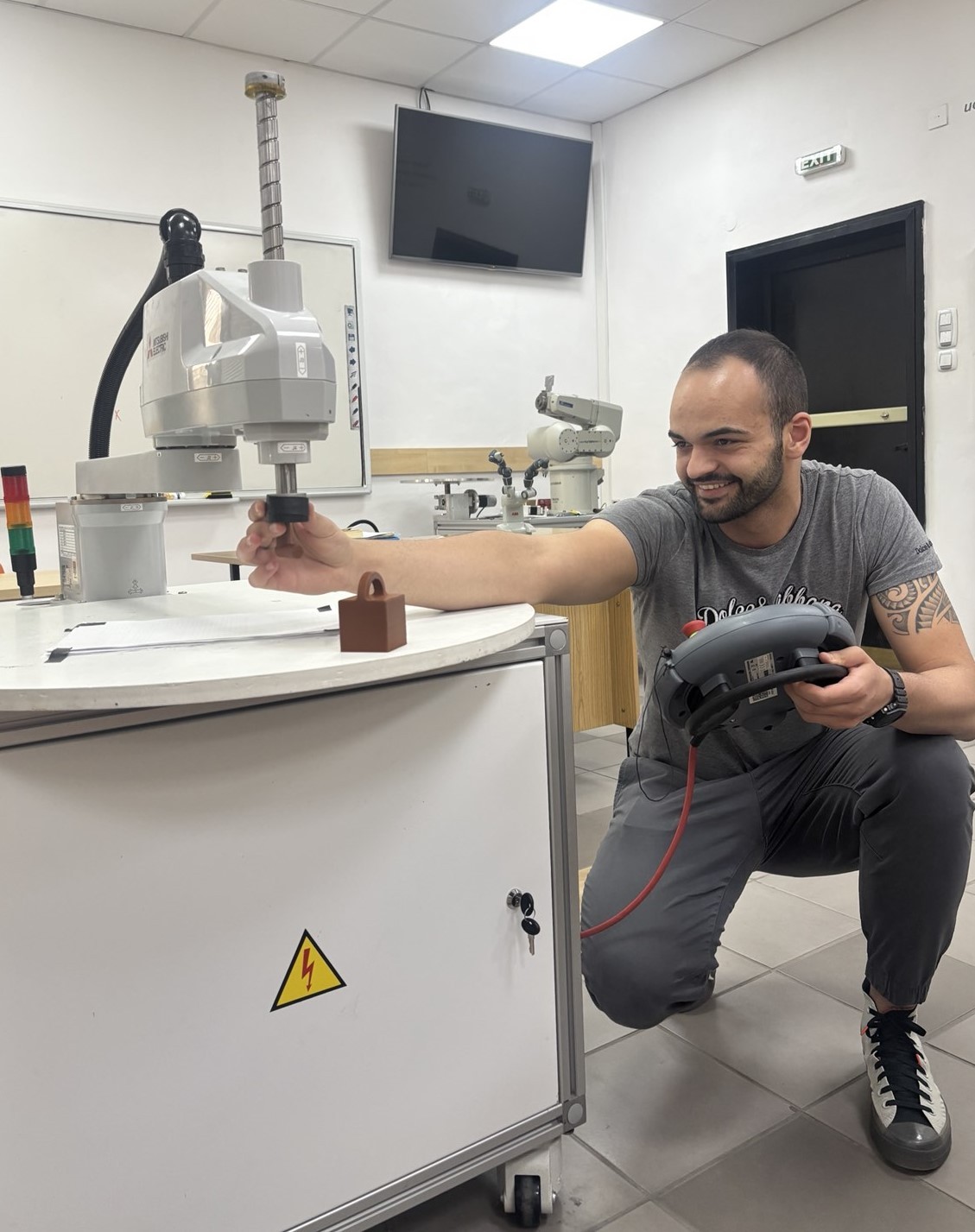 299 Инженер Мехмед Медев – магистър от специалността „Индустриално инженерство“ в Техническия университет – филиал Пловдив е убеден: роботът не трябва да вреди на човека. Това свое убеждение инж. Медев е развил в цялата си дипломна работа „Клетка за безопасност при работа с роботи“. За него е било важно да направи така, че клетката за безопасност да е приложима за всички роботи в света. Идеята го спохожда в университета в град Бърно, Чехия, където през 2023 година той учи няколко месеца по програмата „Еразъм“. Там той се обучава в университетската лаборатория. А в Техническия университет – филиал Пловдив прави крачка напред. Вместо микрокомпютрите, с които в Чехия управляват робота, тук той прилага логически контролер /РLC/ = Кого „слуша“ роботът = Инженер Медев обяснява: „ Всъщност роботът „слуша“ специална система, а тя се управлява от програмируем логически контролер /РLC/. Той е въведен в индустрията като стандарт. Именно програмируемият логически контролер казва кога роботът ще работи и кога ще спира. А аз програмирам този логически контролер. Работа ми беше да избера компонентите, които ще бъдат „очите“ и „ушите“ на тази система. Целта: когато човек се доближи до робота, системата да го види и чуе, точно тя казва на робота: има човек в близост – спри, забави. И точно тя напълно му спира захранващото електричество, за да спре или да даде команда „изчакай“ чрез пауза. Така всъщност се осъществява взаимодействието между индустриалния робот и човека, така че да създадем безопасна работна среда.“ Отличникът-магистрат казва също, че за да научи роботите да разбират човека, най-напред той е трябвало да научи специален език за програмиране Ладър. Защото роботът не говори всеки език. Инженер Медев толкова се „запалил“ по работата си, че започнал да сънува решения на определени научни проблеми, след което ставал, записвал ги и на сутринта отивал в университета, за да ги изпробва. Как роботът да различи човек от муха, влязла в неговото работно пространство? Мехмед Медев е дал отговор и на този въпрос в дипломната си работа. В индустрията се използват светлинни завеси, използват се и лидари, отчитащи обектите, които доближават към робота. Лазерните очи на лидара казват на робота на какво разстояние от него е човекът. Ако човекът е на безопасна дистанция, роботът ще работи 100-процентово. Но все някога някой трябва да обслужи този робот, затова както можем да го пуснем, трябва да можем и да го спрем. Правим интелигентни системи, които позволяват роботът да се съобразява с хората, а не хората с робота – обяснява инж. Медев. И доуточнява: „Аз не съм първият, който работи в тази насока. Най-общо досега изолираме робота в една клетка и за да влезеш в тази клетка първо трябва да натиснеш бутон и ако роботът ти позволи – ще отидеш при него. Това му прекъсва програмата. Тогава трябва да дойде друг техник, за да стартира отново робота. Моят принос е, че аз отключвам клетката на робота, правя това, за което съм дошъл, излизам и роботът продължава да работи, без да има нужда някой друг да дойде и да го стартира отново.“ Научният ръководител на дипломанта е доц. д-р Радослав Хрисчев, на когото младият инженер е много благодарен за подкрепата в трудни моменти, за насоките в разработката и за това, че двамата заедно са разсъждавали върху сложните въпроси на роб