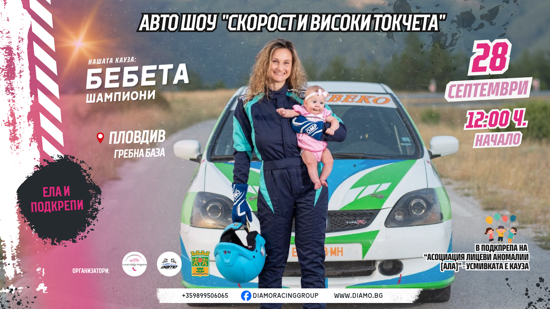 119 Атрактивното Авто шоу „Скорост и високи токчета“ стартира за втора поредна година в гр. Пловдив. Тазгодишното издание ще се проведе в неделя, 28 септември с официално откриване в 12:00 часа. Гребната база ще се превърне в арена на скоростта с много цвят и красота. Събитието ще бъде с благотворителен характер и всички събрани средства ще бъдат предоставени на деца с лицеви аномалии. Дами и няколко господа ще мерят сили зад волана на автомобилите си и ще демонстрират завидни шофьорски умения с прекрасната кауза „Бебета шампиони“. Шоуто ще бъде незабравимо, както за участниците, така и за зрителите, които ще се насладят на невероятни демонстрации и атрактивни умения. Официалното откриване започва в 12:00 часа, а преди това състезателите и автомобилите ще преминат административен и технически преглед. Организатори на тази интересна инициатива са Община Пловдив, Спортен клуб по Автомобилизъм „Диамо“ с подкрепата на партньори и рекламодатели. До момента в офиса на организатора са се регистрирали за участие около 20 екипажа от цялата страна. „За нас като организатори е изключитлно вълнуващо, защото каузата ни е много лична и децата с лицеви аномалии заслужават нашата подкрепа. Входът за публиката е свободен, а забавата и емоцията са гарантирани. Очакваме едно атрактивно събитие да повдигне настроението и приканвам жителите на град Пловдив и околността да се разходят, за да подкрепят смелите участници. Със сигурност е една чудесна възможност за прекарване на почивния неделен ден и ние като организатори ще се постараем да бъде изпълнено с цвят и прекрасни емоции“ – заяви Диана Стоянова, създател и директор на инициативата. Може да ви хареса също МЗ въвежда ясни правила за медицинската помощ от разстояние Почина тв водещата Рени Анастасова Облачно и хладно време утре Заради нарушения Министерството на здравеопазването прекратява обществена поръчка за обработка срещу комари