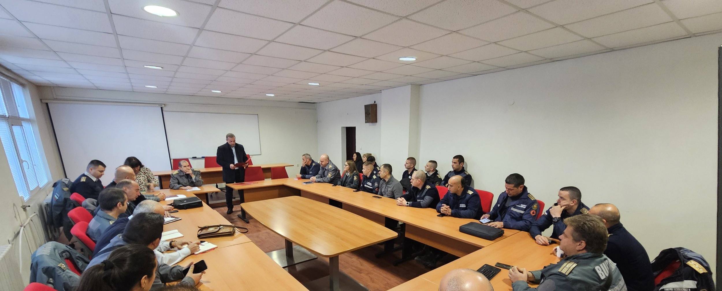 151 Директорът на Регионална дирекция „Пожарна безопасност и защита на населението“ – Пловдив, старши комисар Васил Димов, представи пред служителите на дирекцията новите началници, които поемат ръководни длъжности на ключови позиции, назначени с министерска заповед. Главен инспектор Божил Тодоров ще ръководи сектор „Пожарогасителна и спасителна дейност“, а главен инспектор Иван Мерджанов е назначен за началник на Първа районна служба „Пожарна безопасност и защита на населението“ – Пловдив. И двамата са доказани професионалисти с богат опит в пожарната безопасност и спасителните дейности, и се очаква тяхното назначение да допринесе за ефективното изпълнение на мисията на дирекцията в региона. Директорът на РДПБЗН – Пловдив пожела на новите ръководители успешна работа и високи професионални постижения в новите им отговорности. Може да ви хареса също Земетресение до Благоевград На Йордановден Пловдивският митрополит Николай ще отслужи Велик Богоявленски водосвет на брега на река Марица Утре ще е облачно, но малко по- топло Вдигат възрастта и стажа за пенсия от 1 януари