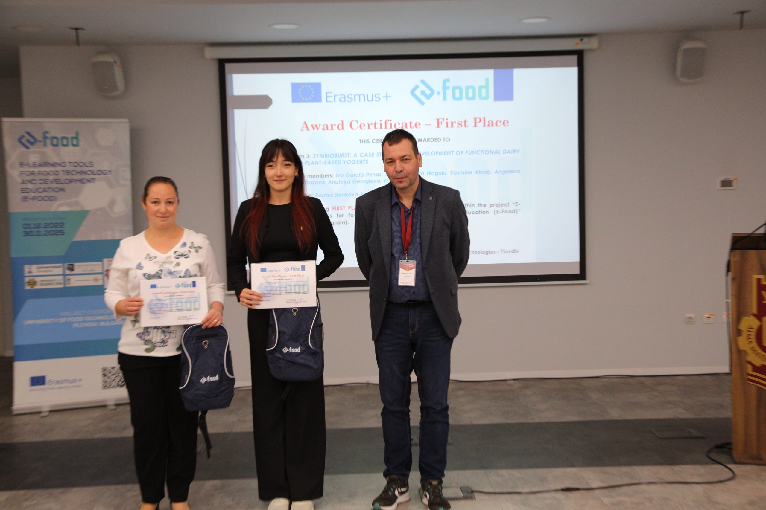 34 В периода 12 – 15 ноември 2025 г. в аудитория „Хоризонт“ на Университета по хранителни технологии – Пловдив се проведе заключителната среща и workshop по проект E-FOOD – “E-learning tools for Food technology and development education” (№ 2022-1-BG01-KA220-HED-000085089) ( https://e-food.uft-plovdiv.bg/), финансиран по програма „Еразъм+“. Събитието бе част от Международната научна конференция „Хранителна наука, техника и технологии – 2025 г.“ и включваше различни елементи – работна среща, Еразъм+ ден и награждаване на победителите във виртуалните състезания по проекта. Проектът E-FOOD обединява 5 университета от България, Испания, Франция, Румъния и Унгария с цел разработване на дигитални образователни стандарти, бази данни и онлайн курсове в областта на хранителните технологии. В рамките на заключителната среща бяха представени основните резултати: • разработени образователни стандарти и модели за дигитално обучение; • специализирани бази данни и електронни курсове в областта на хранителните технологии; • концепция за устойчиво международно партньорство в областта на дигиталното образование във висшето образование. Акцент в събитието беше награждаването на студентите и докторантите, участвали във виртуалните състезания E-FOOD VIRTUAL COMPETITIONS. В рамките на тези състезания бяха създадени многонационални екипи от студенти и докторанти от партньорските университети, като всеки екип работеше под ръководството на ментори – преподаватели от консорциума. Задачата на отборите беше да разработят Case study за нов хранителен продукт – включващ продуктова концепция, технологична схема и маркетингова презентация – като използват базите данни и учебните материали, разработени по проекта. Екипите имаха на разположение пет месеца за подготовка, след което представиха своите разработки по време на онлайн семинар – https://www.youtube.com/@E-Food-UFT. Специално жури, включващо представители от консорциума и бизнеса, оцени и класира проектите според предварително обявени критерии, а най-добре представилите се отбори бяха отличени по време на заключителната среща в УХТ – Пловдив. Участниците получиха сертификати и признание за постигнатите резултати, като за много от тях това беше и първа стъпка към бъдещо участие в международни научни и образователни инициативи. В своите приветствия представителите на ръководството на УХТ и на партньорските университети подчертаха, че виртуалните състезания по разработване на нови храни са успешен пример как дигиталните инструменти могат да подкрепят практическо-ориентираното обучение, международната екипна работа и развитието на предприемачески и иновационни умения у студентите. По време на Еразъм+ Деня в аудитория „Хоризонт“ бяха представени възможностите за студентска и преподавателска мобилност и партньорската мрежа на университета в рамките на проект E-FOOD. В събитието взеха участие представители на University of Zaragoza, Испания, Université Claude Bernard Lyon 1, Франция, Lucian Blaga University of Sibiu, Румъния, University of Debrecen, Унгария, Research Institute for Animal Production Nitra, Словакия, както и домакинът УХТ, България, които представиха своите програми, изследователски направления и перспективи за бъдещо сътрудничество. Организирането на заключителната среща в рамките на ЕРАЗЪМ+ Ден 2025 и Международната научна конференция „Хранителна наука, техника и технологии – 2025 г.“ даде възможност резултатите от проекта E-FOOD и ви