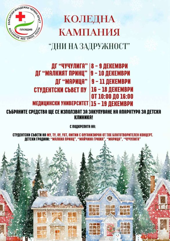 18 Поредица от благотворителни коледни базари ще събира средства за изграждащата се Детска клиника към УМБАЛ „Св. Георги“ в Пловдив. Инициативата е на областната организация на Българския младежки Червен кръст съвместно с партньори – детски градини и висши училища. Акцията ще продължи от 8 до 19 декември 2025 година. Всеки последовател на кампанията „Дни на задружност“ ще има в определени дни свой базар, където да предлага ръчно изработени или закупени изделия. Това ще даде възможност за изява на деца, ученици и студенти, а същевременно всички заедно ще подкрепят една хуманна кауза. На призива на БМЧК-Пловдив откликнаха студентските съвети на Пловдивския университет „Паисий Хилендарски“ и Медицинския университет, които подготвят благотворителни щандове. Подкрепа заявиха също от Университета по хранителни технологии, Техническия университет, Аграрния университет и Академията за музикално, танцово и изобразително изкуство с благотворителен концерт. Включиха се и детските градини „Малкият принц“, „Майчина грижа“, „Марица“, „Чучулига“. Щафетата от коледни базари стартира на 8 декември в ДГ „Чучулига“. Ето графика до финала: • 8-9 декември – ДГ „Чучулига“ • 9-10 декември – ДГ „Малкият принц“; • 9-11 декември – ДГ „Марица“; • 16-18 декември от 10 до 16 ч. – Пловдивски университет; • 15-19 декември – Медицински университет. Парите от продажбите ще бъдат предоставени за закупуване на апаратура за новия педиатричен комплекс в УМБАЛ „Свети Георги“. В него ще се лекуват деца от цяла Южна България. Кампанията „Дни на задружност“ ще покаже как най-младото поколение пловдивчани може да се обедини и да бъде полезно на града със своя доброволчески ентусиазъм. Може да ви хареса също Ръст на потребителската кошница с 1 лв. Нова наредба: Задължителен тест за алергии преди боядисване във фризьорските салони Четирима души от екипажа на кораба Кайрос са евакуирани тази сутрин Студентка от Пловдив прави копие печатарската машина на Христо Г. Данов със своята стипендия