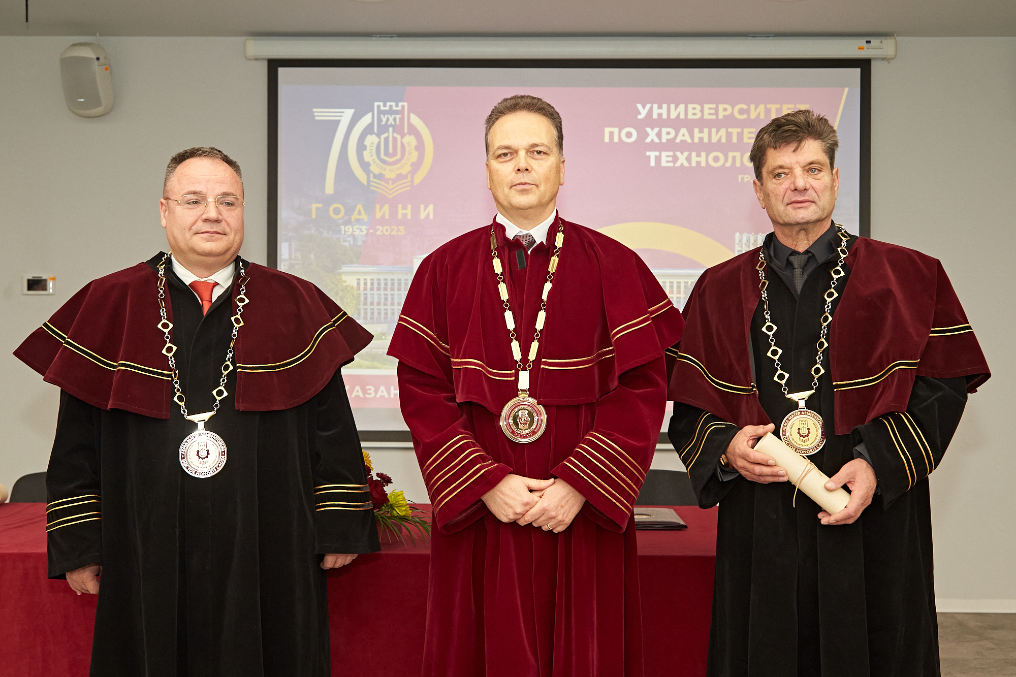 105 Инж. Владимир Кисьов и проф. Иво Димитров бяха удостоени с почетното звание “Доктор хонорис кауза” на Университета по хранителни технологии Пловдив. Това стана на тържествено заседание на Академичния съвет на висшето училище. Инж. Владимир Кисьов е роден на 25 февруари 1966 г. в гр. Пловдив; придобива магистърска степен, специалност “Технология на животинските хранителни продукти, консервиране и обществено хранене”, специализация “Технология на продуктите за обществено хранене” във Висшия институт по хранително-вкусова промишленост (понастоящем УХТ Пловдив) през 1990 г. Инж. Кисьов притежава изключително успешна кариера в областта на бизнес предприемачеството, с над тридесет годишен опит, като управител и съдружник, във фирми от сферата на туризма и услугите, в изграждането на комплекси по нашето Черноморие, както и продажбите и управлението им и в градовете Пловдив, София, Свиленград. Инж. Кисьов е Общински съветник в гр. Пловдив от 2007 г. до момента, Председател е на комисията по екология към Общинския съвет, както и Почетен консул на Република Екваториална Гвинея в България от 2012 г. Ректорът на УХТ проф. Галин Иванов изложи мотивите за удостояването с почетното звание “Доктор хонорис кауза”. “Инж. Владимир Кисьов е сред най-изтъкнатите представители на бизнес средите в България. Статутът му на бивш възпитаник на Университета по хранителни технологии е не само имиджов актив на УХТ, но и основа за изграждане на устойчиво партньорство с бизнес структурите му, включващи фирми в туристическия бранш, строителството, недвижимите имоти, оранжерийното производство и земеделието. Цялата хотелска база на инж. Кисьов е на разположение студенти от УХТ за провеждане на стажове, практики, обучение и се разчита да бъде обезпечена със служители, завършили университета”, заяви проф. Галин Иванов. Ректорът добави, че като възпитаник на УХТ инж. Кисьов е отдаден изцяло за издигането на неговия авторитет и просперитет и е един от най-крупните му дарители. С неговото съдействие университетът придобива солиден актив под формата на напълно обновена кулинарна лаборатория към катедра “Туризъм и кулинарен мениджмънт”, където студентите ще бъдат обучавани в модерна иновативна среда и ще се канят световно известни лектори. “От сърце благодаря на всички вас за тази огромна чест, за доверието и за топлото приемане в академичното семейство на УХТ. Този момент ще остане завинаги част от моя личен и професионален път. Приемам присъждането на званието “Доктор хонорис кауза” на Университета по хранителни технологии с най-дълбока благодарност, смирение и почит. Това високо отличие е чест, която ме задължава да продължа да работя всеотдайно за укрепване на връзките между академията и бизнеса, да подкрепям развитието на младите таланти и да допринасям за издигането на авторитета на нашия университет”, заяви развълнуван инж. Кисьов. Последва и награждаването на проф. Иво Димитров. Той придобива магистърска степен по специалност “Финанси” в Стопанска академия Свищов през 2003 г., както и магистърска степен по специалност “Здравен мениджмънт” в Медицински университет София през 2019 г. През 2016 г. защитава дисертация за образователна и научна степен “Доктор”, от 2020 г. е доцент по здравен мениджмънт към ВУАРР Пловдив, а през 2024 г. защитава дисертация за д