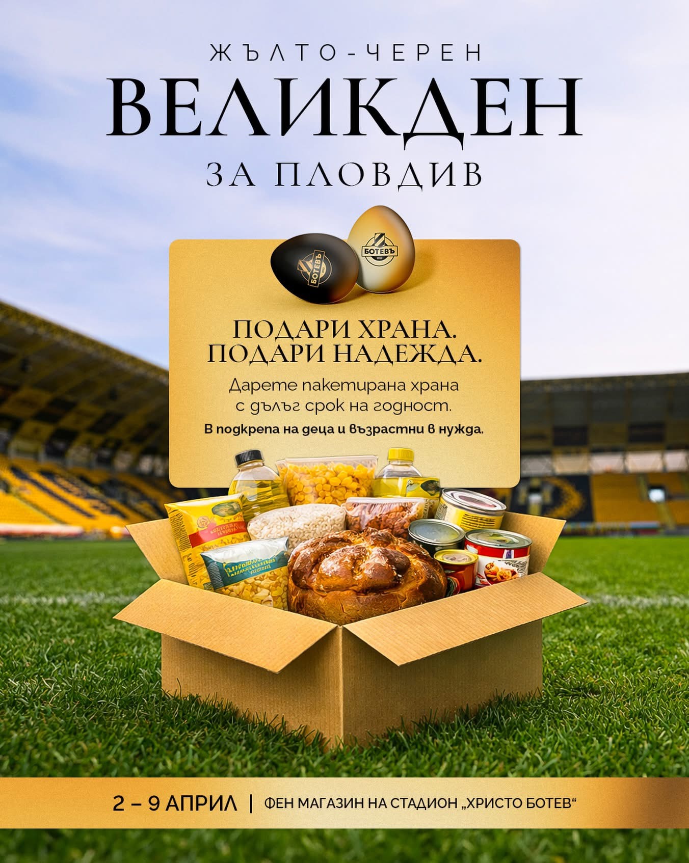 88 Ботев Пловдив стартира благотворителна кампания под надслов „Жълто-черен Великден за Пловдив“, посветена на предстоящия празник Възкресение Христово. Инициативата има за цел да подпомогне хора в нужда чрез събиране на хранителни продукти с дълъг срок на годност. Кампанията ще се проведе в периода от 2 до 9 април включително. Във фен магазина на стадион Стадион „Христо Ботев“ в Пловдив ще бъде поставена специална кутия за дарения, в която всеки желаещ може да остави пакет със суха храна. Организаторите посочват, че подходящи за дарение са продукти като ориз, брашно, овесени ядки, боб, леща, грах, консерви, бисквити, вафли, кроасани, сухи пасти и козунак, като задължително условие е те да бъдат пакетирани и с дълъг срок на годност. В инициативата ще се включат футболистите, треньорският щаб, ръководството и служителите на клуба, които също ще дарят хранителни пакети. След приключването на кампанията събраните продукти ще бъдат разпределени и доставени до деца в центрове за настаняване от семеен тип и приемни семейства, както и до възрастни хора в домове и социални услуги. От клуба призовават привържениците и гражданите да се включат активно, като подчертават, че обединените усилия могат да помогнат на нуждаещите се в навечерието на празниците Може да ви хареса също Внимание, опасно време: Жълт и оранжев код за значителни валежи над страната Ръст на туристите от балканските страни се наблюдава в Пампорово през този ски сезон Дете увисна от тераса на 8-ия етаж в Ямбол Великденски благотворителен базар в Съдебната палата в Пловдив на ученици от ОУ „Княз Александър I“