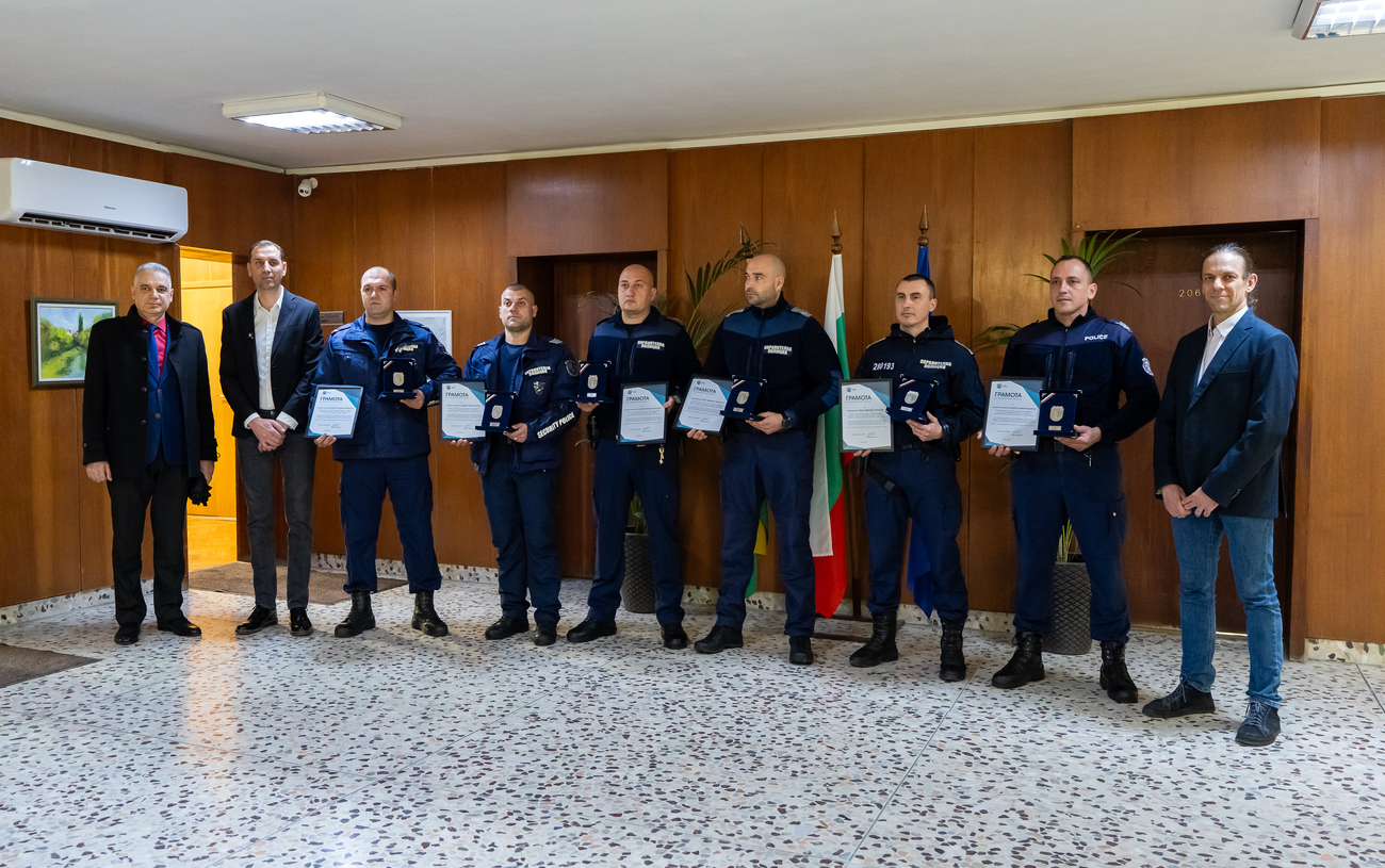 120 Служители на група „Патрулно-постова дейност“ в сектор „Охранителна полиция“ към РУ-Ямбол бяха удостоени от кмета на Ямбол Валентин Ревански с почетния знак „Герб на община Ямбол“ и почетни грамоти за отговорно изпълнение на служебните им задължения и проявен героизъм. Вчера те спасиха във високорискова ситуация 3-годишно дете от падане от висока сграда. Смелостта, премереният риск и професионалните действия на полицейските служители предотвратиха трагичен край на инцидента. На тържествена церемония в сградата на общината днес бяха връчени почетният знак и грамоти на участниците в спасителната акция – инспекторите от РУ-Ямбол Иван Топалов, Милена Андреева и Петър Облаков и младши инспекторите Ивайло Димитров, Мартин Петров, Даниел Петров и Красимир Москов. „Има моменти, в които човек не мисли за себе си, а просто действа, за да спаси друг. Вие направихте точно това“, каза кметът г-н Ревански в своето обръщение към полицаите и допълни, че именно в такива моменти обществото ясно вижда колко важна е ролята на тези служители, които носят отговорност не само по закон, но и по съвест. Благодарност към полицаите изразиха също председателят на Общински съвет-Ямбол Антон Шиков и старши комисар Добрин Димитров, директор на Областната дирекция на МВР. За проявена гражданска доблест с почетния знак „Герб на община Ямбол“ и почетна грамота беше удостоен и Диньо Ганев – гражданин, участвал в спасителната акция. Може да ви хареса също Дъжд и слънце за Великден Учител от Хуманитарната гимназия в Пловдив е загиналият при тежката катастрофа, блокирала Подбалканския път Димитър Маргаритов: Тепърва ще видим на рафтовете стоките, които сега се возят на по-високи цени Пожарната нащрек за Великден