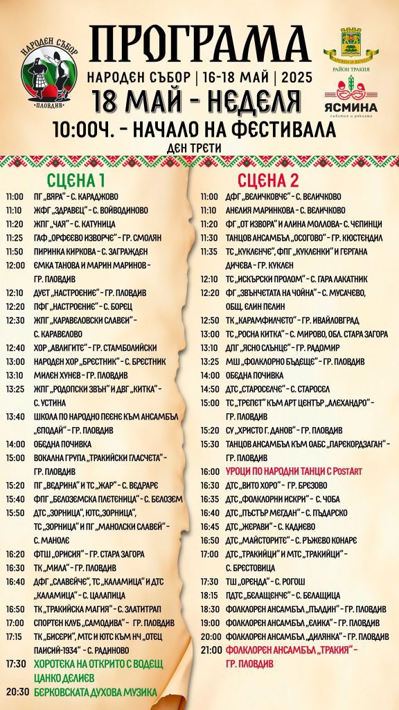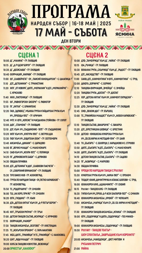 522 Кметът на Пловдив Костадин Димитров снощи откри официално едно от най-мащабните събития в културния календар на града – Народен събор 2025. В любимия на пловдивчани и гостите на града парк „Лаута” юбилейното 10-то издание започна с фолклорни изпълнения на участници от цялата страна. „Народният събор е празник, който събира поколения, традиции и обич към родното. Тук се роди и продължава една прекрасна идея, която с годините се превърна в символ на българщината. Благодаря на всички, които пазят духа жив – изпълнители, танцьори, занаятчии, организатори, гости. За десети път Пловдив е домакин на този уникален фестивал, който вече има своето достойно място в богатия събитиен календар на града ни“, заяви кметът на Пловдив Костадин Димитров при откриването. Кметът на район „Тракия“ Георги Гатев също поздрави присъстващите, благодари на организаторите в лицето на Димитър и Петя Михови, на администрацията за подкрепата и на многобройните изпълнители от цялата страна, чийто брой надхвърля 4500. През трите фестивални дни – 16, 17 и 18 май, посетителите ще могат да се насладят на фестивална алея с над 60 традиционни занаята, демонстрации на ковачи, грънчари, дърворезбари и тъкачи, уроци по народни танци, изложби, детски работилници, възстановки и юнашки тренировки, както и на жива музика и танци без прекъсване. Инициатори на събора са Петя и Димитър Михови от фирма „Ясмина“, а Община Пловдив и район „Тракия” – партньори и съорганизатори. Народен събор 2025 те очаква в пловдивския парк „Лаута” – 10 години традиция, емоция и български дух. Заповядайте!, призовават организаторите. Може да ви хареса също Сдружение „Бизнесът за Пловдив“ с дарение за социалния патронаж Кметът Костадин Димитров посрещна новия католически епископ на Софийско-Пловдивския диоцез Голям ръст на туристите в Пловдивска област График за почистване на дъждоприемни шахти от 12 до 16 януари