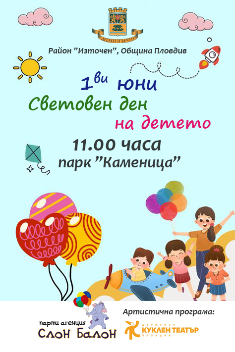 127 Голямо тържество на 1-ви юни – Световен ден на детето, ще се проведе в парк „Каменица“. Началото е от 11.00 часа, съобщи кметът на район „Източен“ Емил Русинов. Организаторите са подготвили за малчуганите куклен театър, много изненади, подаръци, забавни игри със „Слон Балон“ и много балони. Ето и цялата празнична програма: 11.00 ч. – 11.40 ч. – „Храбрият дървар“ – Държавен куклен театър – Пловдив; 11.50 ч.- 12.20 ч. – Детска дискотека с водеща Таня Карова; 12.20 ч. – 12.50 ч. – Рисунка на асфалт; 12.50 ч. – 13.00 ч. – Томбола с награди; 13.00 ч. – 14.00 ч. – Забавни игри с аниматори от „Слон Балон“, – Супер Марио и рисунки на лице 14.00 ч. – 14.15 ч. – Томбола с награди „Ще ви очакваме в парк „Каменица“ да се забавляваме заедно, отправи покана кметът на „Източен“ Емил Русинов. Може да ви хареса също Пари за вот? Разбиха схема в „Столипиново“ със списъци и хиляди евро кеш Първи кръг на Републиканско по фидер риболов се провежда на Гребния канал в Пловдив Нова образователна здравна програма започва в детските градини в Пловдив Пловдив оживява с цветовете на Великден