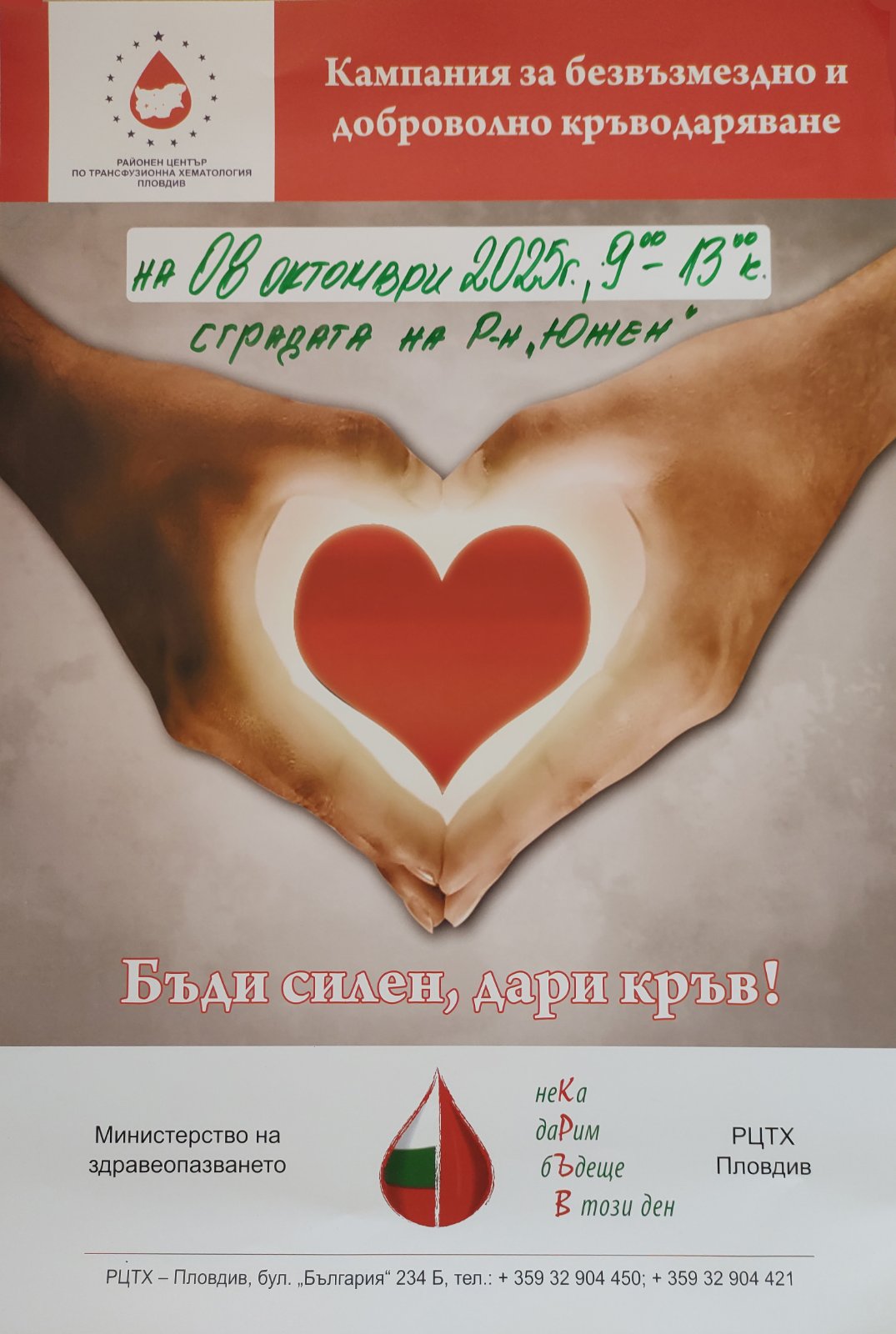 575 Район „Южен“ организира акция по безвъзмездно и доброволно кръводаряване. Инициативата се провежда съвместно с Районен център по трансфузионна хематология – Пловдив. Акцията „Бъди силен, дари кръв!“ ще се проведе на 8 октомври между 9:00 и 13:00 часа в сградата на районното кметство. „Няма по-велико дело от това да се помогне на човек в нужда. Нека всеки, който може и има желание, да се включи в тази благородна инициатива и да дари кръв“, призова кметът на район „Южен“ Атанас Кунчев. Може да ви хареса също Близо 2500 искат премахване на мантинелите по Околовръстното в Пловдив Най-мръсният въздух е в Пловдив от петък до неделя Костадин Димитров: Работим много близо с държавата – няма да теглим заем 7-годишното дете, оцеляло при трагедията край Пловдив, е в съзнание