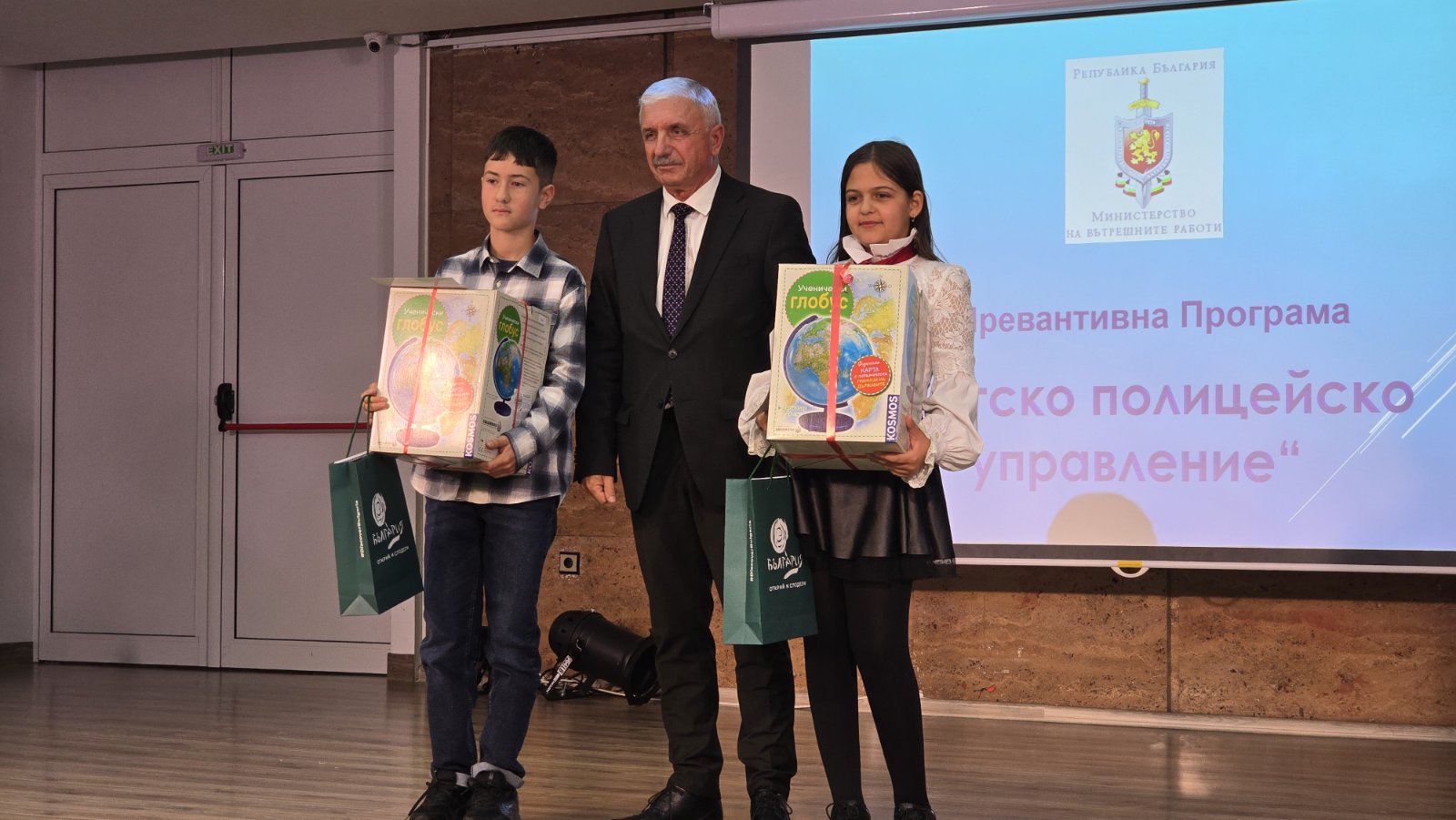 335 Четвъртокласничката Ивайла Назлъмова от СУ “ Св. Паисий Хилендарски“ спечели първа награда в петото издание на конкурса за детска рисунка „Аз и моето полицейско управление“, организиран от Министерство на вътрешните работи. Тя беше наградена от зам.-министъра на МВР Любомир Йосифов на специална церемония, която се проведе в Националния дворец на децата в София. Официален гост беше и кметът на район „Централен“ Георги Стаменов, който поднесе своите поздравления на Ивайла, нейната преподавателка госпожа Анелия Иванчева и майка й Нина Гешева. Малката художничка беше подкрепена и от служителите от Детска педагогическа стая към Четвърто РУ в Пловдив – инсп. Щерева и инсп. Минков. Нейната рисунка беше отличена от общо 119 творби от цялата страна, които преминаха през регионален и национален етап на оценяване през годината. По темата четвъртокласничката е творила, вдъхновена от своето училище, съучениците си, полицаите и правилата за пресичане на пътя. На церемонията бяха връчени общо 13 награди в две възрастови категории – от 2 до 4.клас и 5 – 6.клас. Всички номинирани получиха грамота и предметна награда, осигурени от Главна дирекция „Национална полиция“. Конкурсът „Аз и моето полицейско управление“ е част от дългогодишната инициатива на МВР „Детска полицейска академия“, която насърчава децата към отговорност и цели превенция на тяхната безопасност като участници в движението. Ивайла е сред 23-те деца от СУ „Св. Паисий Хилендарски“, които се обучават в двугодишната програма на вътрешното ведомство. По традиция картините в националната изложба се разпродават между служителите на МВР, а средствата се предоставят на децата на загинали техни колеги. Може да ви хареса също Най-мръсният въздух е в Пловдив от петък до неделя Костадин Димитров: Работим много близо с държавата – няма да теглим заем 7-годишното дете, оцеляло при трагедията край Пловдив, е в съзнание Премиерът Желязков разпореди денонощно наблюдение на река Струма и водосбора й по цялото течение от язовир Студена