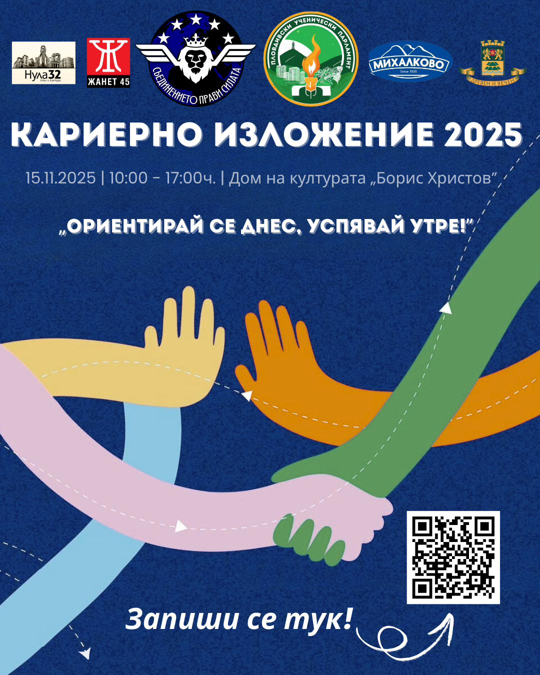 16 Пловдивски ученически парламент и пловдивското подразделение на младежкото сдружение „Съединението прави силата“ организират кариерно изложение под надслов „Ориентирай се днес, успявай утре“. Събитието ще се проведе на 15 ноември в Голяма конферентна зала на Дом на културата „Борис Христов“ от 10 до 17 часа. Целта на форума е да подкрепи над 100 гимназисти в процеса на осъзнат кариерен избор. Студенти и родители на млади хора също са добре дошли. Чрез личните истории и опит на над 10 експерти от цяла България, те ще имат възможност да чуят за реалните пътища на развитие, да зададат важни въпроси и да разберат какви умения и нагласи са нужни за успех. Посетителите ще имат шанса да се срещнат с професионалисти от различни направления, някои от които лекари, архитекти, инженери, адвокати, предприемачи, маркетинг и PR специалисти, преподаватели, НПО специалисти, младежки работници, инфлуенсъри. Участниците ще могат да участват и в томбола с много награди. Линк към пълната програма може да откриете в Инстаграм: plovdiv.student.parliament. Крайният срок за записване е 12.11.2025 година в 23:59 часа. За допълнителна информация може да се свържете с организаторите на телефон: 0878594275 и 0988856034 или e-mail: [email protected]. Организатори на събитието са Пловдивски ученически парламент и Сдружение „Съединението прави силата” – клон Пловдив, в партньорство с Община Пловдив – Район „Западен”, Списание „032“, Издателство „Жанет 45“ и Компания „Михалково“. Може да ви хареса също Удължават с два дни срока на конкурса за млади предприемачи на Пловдив поради засилен интерес Световноизвестната джаз певица Лиз Райт засажда дърво в Пловдив ДГ „Майчина грижа“ и „Ангели на пътя“ с конкурс за детска рисунка Доброволци залесиха опожарената част от Младежкия хълм в Пловдив