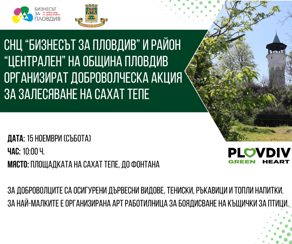 62 На 15 ноември от 10 часа на Сахат тепе ще се състои залесителна акция, в която ще бъдат засадени 100 дървета от различни растителни видове – копривки, дъб, черен бор и бял ясен. Инициативата е част от по-мащабната кампания „Зеленото сърце на Пловдив“ (Plovdiv Green Hearth), в която СНЦ „Бизнесът за Пловдив“ и район „Централен“ обединиха усилията си по възстановяване на хълма в началото на годината. В акцията ще вземат участие представители на администрацията и компаниите от сдружението. Добре дошли са и доброволци на които на място ще бъдат раздадени ръкавици и рекламни тениски. От общинското предприятие „Градини и паркове“ са подготвили предварително местата за засаждане с подходящите дълбочини за всеки от различните видове растения. Като част от акцията от бизнес организацията ще поставят пейки на хълма, за доброволците ще осигурят топли напитки, а децата ще могат да поставят дървени къщички за птици, които предварително да оцветят в специално обособен кът. „След пролетното почистване и отстраняване на сухите клони и дървета е време да продължим с работата по облагородяването. Имаме годишен план, който изготвихме заедно с кмета Георги Стаменов и неговите еколози. Обществено отговорно е да не се работи на парче, а заедно и в синхрон“, споделя Александър Стайков, изпълнителен директор на сдружението. Съвместните дейности по облагородяване на тепетата ще продължат и през следващата година, когато ще се работи усилено по изграждане на напоителни системи, видеонаблюдение, парково обзавеждане. Може да ви хареса също Първият полет по линията Пловдив-Братислава ще бъде посрещнат в събота Кметът Костадин Димитров: Изграждаме нова улица в „Западен“ – „Парк Отдих и култура” Започва санирането на многоетажна сграда в район „Централен“ Словенецът с пловдивско сърце: Пловдив отбелязва 110 години от кончината на проф. Антон Безеншек
