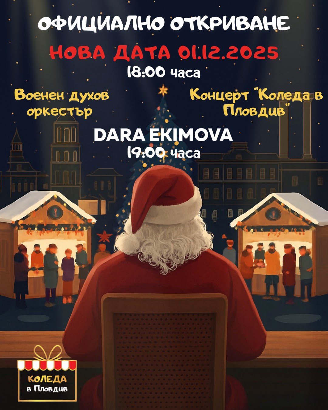 15 Пловдив поставя началото на първото издание на „Коледа в Пловдив“ – ново мащабно и вдъхновяващо празнично събитие, което в периода от 28 ноември до 4 януари ще превърне централната част на града в сияйна коледна приказка с концерти, атракции, базар и впечатляващи преживявания за всички поколения. Празничното начало ще бъде дадено на 1 декември, когато веднага след запалването на светлините на градската елха ще започне програмата на сцената пред Пощата на площад „Централен“. В 18:15 ч. парад и концерт на Военния духов оркестър на Съвместното командване на специалните операции ще внесат първите тържествени акорди, а в 18:30 ч. официалното откриване с участието на кмета на Пловдив г-н Костадин Димитров и представители на Фондация „Пловдив 2019“ ще даде старт на зимните празници в града. На сцената ще се представят някои от най-талантливите млади артисти. Малко след 19:00 ч. сцената ще посрещне и музикалния идол Дара Екимова, която ще даде начало на поредицата от големи концерти на събитието. Първата седмица на „Коледа в Пловдив“ обещава силно начало с едни от най-обичаните български изпълнители. На 7 декември от 18:00 ч. за първи път в Пловдив невероятната Нели Петкова и Биг Бенд Пловдив ще представят съвместен коледен концерт със специалното участие на обичания актьор Виктор Калев. Малко преди тяхното представяне публиката ще се наслади на „Тайното шоу на…“ – впечатляващ спектакъл-изненада с артисти, които остават в тайна до появата им на събитието. Сред водещите музикални акценти през декември са концертите на рок легендите „Сигнал“ на 13 декември, на Роби на 20 декември, както и съвместната изява на музикалните сензации Филип Донков и Александър Колев на 27 декември. Празничните концерти ще продължат всеки петък, събота и неделя до 4-ти януари. Коледната атмосфера в Пловдив ще бъде обогатена от впечатляващи тематични атракции – Асансьорът на Дядо Коледа, Каруселът – Коледна елха, творческата работилница „Гуш“ и Пощата на Дядо Коледа, както и уютни коледни къщички, предлагащи характерни сезонни вкусове, топли напитки и ароматно греяно вино. През целия период ще се провеждат и театрални и балетни представления, творчески занимания, прояви на коледари и кукери и демонстрации на български и европейски празнични обичаи. С първото си издание „Коледа в Пловдив“ цели да се утвърди като нов отличителен акцент в празничния календар на града – събитие, което обединява светлини, традиции, изкуство и музика в едно незабравимо зимно преживяване. Програмa „Коледа в Пловдив“ – Част 1 28.11-07.12.2025Г. 01.12.2025 /Пoнеделник/ 18:15 – Тържествен парад и концерт на Военния духов оркестър на Съвместното командване на специалните операции (СКСО) 18:30 – Официално откриване и концерт „Коледа в Пловдив“ с участието на Art Voices & Ивон Лочова /Център за изкуства „Зорница“- София/ 19:00 – ДАРА ЕКИМОВА 05.12.2025 /Петък/ 17:30 – Танцова формация към училище по изкуства „Кирил и Методий“ Пловдив 18:00 – Школа по модерно пеене с преподавател Венера Манчева към НЧ “ Христо Г. Данов-1904“ 18:30 Школа по пеене при НЧ „Съвременник – 1986“ – Лилия Гатешка, Мария Банкова, Йоана и Бисерка Маринови 19:00 – Женски народен хор „Плетеница“ при Народно читалище „Съвременник-1986“ 06.12. 2025 /Събота/ 12:00 – Балет „Електра“ 12:20 – Art Voices 18:00 – Art Voices 18:30 – The River Of Blues 07.12.2025 /Неделя/ 12:00 – Art Voices 12:40 – Вокална група „