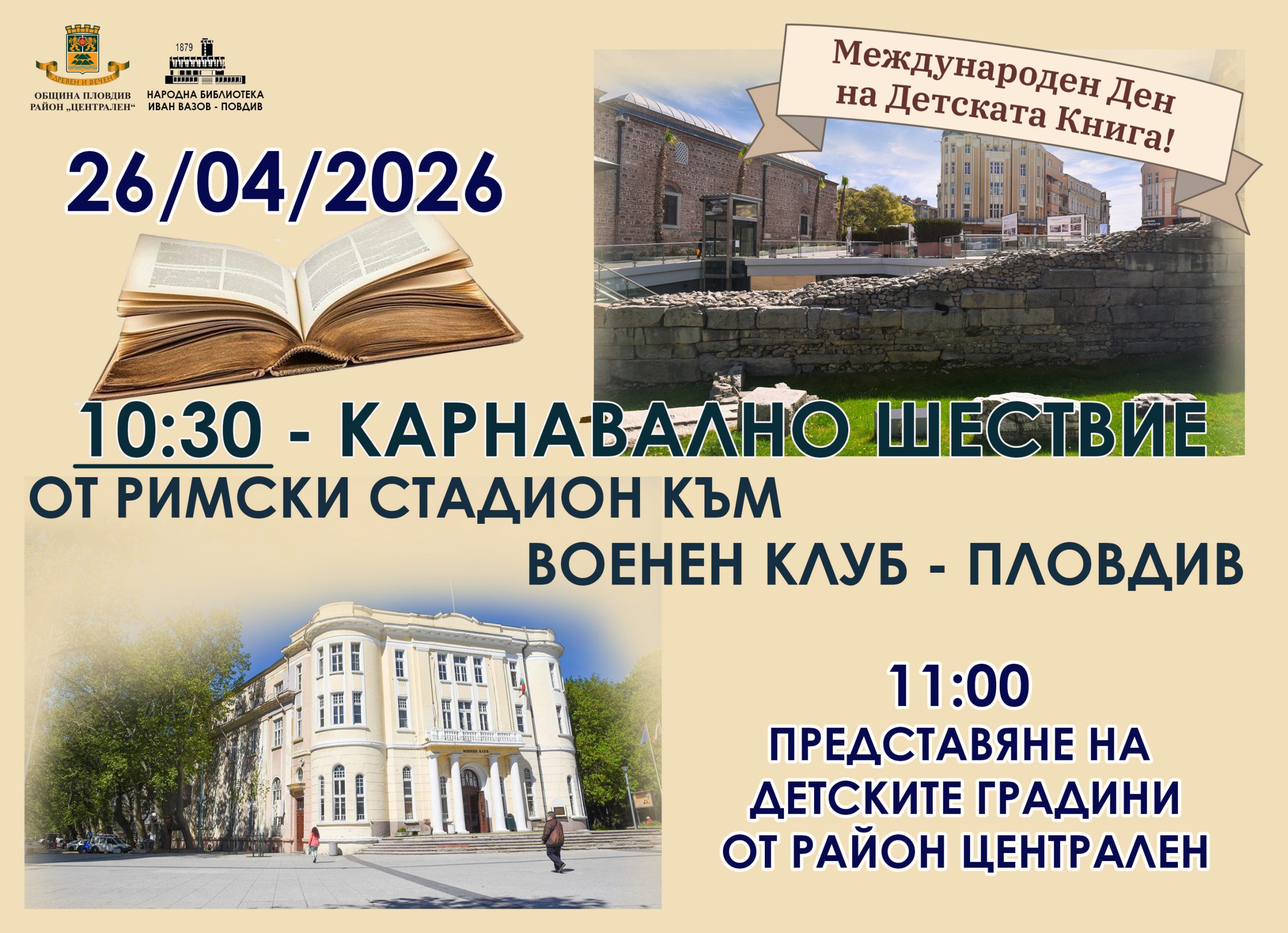 41 На 26 април 2026 г. от 10:30 часа от Римски стадион на Филипопол ще започне пъстро и вдъхновяващо карнавално шествие, посветено на месеца, в който отбелязваме Международния ден на детската книга. Инициативата се организира от район „Централен“ в партньорство с Детския отдел на Народна библиотека „Иван Вазов“. В празничното шествие ще се включат деца от детските градини в район „Централен“ и възпитаниците на „Академия Госпожа Опера“, които ще оживят улиците на града, преобразени като любими приказни герои. С много цвят, музика и настроение децата ще преминат през пешеходната улица и ще се съберат пред Военен клуб – Пловдив. Шествието ще бъде водено от мажоретния състав към СУ „Паисий Хилендарски“ и ФАФ „Куклици“ към ЦПЛР – ОДК Пловдив, които ще допринесат за празничната атмосфера с впечатляващи изпълнения. Специално изработени от Маскот мастърс гигантски кукли на горски феи, Робин Худ, еднорози и понита ще са най-голямата атракция на събитието. Финалът ще предложи на участниците и гостите истинско потапяне в света на книгите. Специален щанд с детски издания от фонда на библиотеката ще даде възможност на малките читатели да се докоснат до любими и нови заглавия, а „Феята на книгите“ ще ги поведе в магично пътешествие из безкрайните истории. Всяко дете ще има възможност да се изяви на сцената и да представи своя герой. Събитието е не просто празник, а вдъхновяваща покана към децата да четат, да мечтаят и да откриват нови светове. Книгите изграждат ценности, насърчават въображението и създават незабравими спомени. Организаторите канят всички жители и гости на Пловдив да се присъединят към този празник на детството, книгите и въображението. Може да ви хареса също За Деня на земята в Пловдив започва кампания за събиране на отработени масла Кметът инспектира обновена ключова градска зона в центъра Започна кандидатстването за прием в първа група на детските градини в Пловдив за учебната 2026/2027 г., обявени са 2095 места График за миенето на пловдивските улици от 20 до 24 април