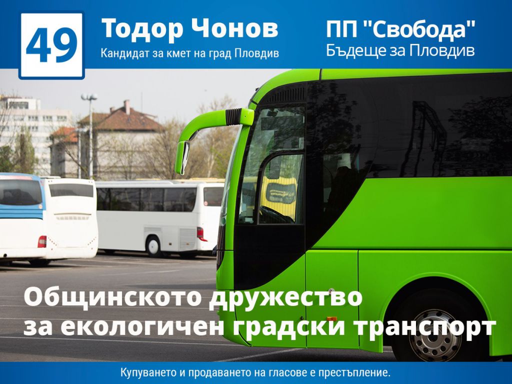 180 Кандидатът на ПП „Свобода“- Бъдеще за Пловдив за кмет на Пловдив Тодор Чонов смята, че общинско предприятие за екологичен транспорт ще реши проблема с трафика и замърсяването на въздуха в града. „По-малко автомобили по улицата, по-малък трафик и по-чист въздух – но как да стане това, след като сме единственият голям град без собствен транспорт, а частните превозвачи не успяват да покрият очакваното ниво на услугата? За да променим ситуацията и предоставим на хората по-добри условия, с екипа ми насочихме усилията си към създаването на общинско дружество за екологичен градски транспорт. В тази връзка разработихме нови маршрутни линии, които да свързват по-голяма част от училищата и висшите учебни заведения в Пловдив и да подобрят връзките с железопътния транспорт. Развитието на общинското предприятие ще продължи да е сред най-важните акценти в управленската ми програма, ако бъда избран за кмет на Пловдив“, категоричен е досегашния зам.- кмет по транспорт Тодор Чонов. ПП „Свобода“ е с №49 в интегралната бюлетина. Купуването и продаването на гласове е престъпление. Може да ви хареса също Слави Трифонов определи присъдата срещу Люпчо Георгиевски като поредна политическа антибългарска репресия Над 180 000 опита на мигранти да влязат у нас са предотвратени от гранични полицаи през миналата година Близо 3400 сигнала за изборни нарушения са постъпили в прокуратурата Кметът и общинските съветници в Кричим положиха клетва
