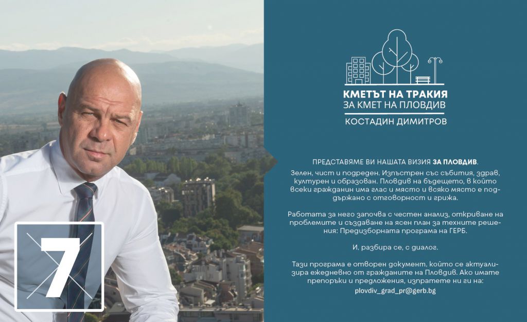 268 Представяме ви нашата визия за Пловдив. Зелен, чист и подреден. Изпъстрен със събития, здрав, културен и образован. Пловдив на бъдещето, в който всеки гражданин има глас и място и всяко място е поддържано с отговорност и грижа. Това обяви досегашният кмет на Тракия и кандидат за кмет на Пловдив от ГЕРБ Костадин Димитров. „Работата за него започва с честен анализ, откриване на проблемите и създаване на ясен план за техните решения: Предизборната програма на ГЕРБ. И, разбира се, с диалог. Тази програма е отворен документ, който се актуализира ежедневно от гражданите на Пловдив. Ако имате препоръки и предложения, изпратете ни ги на: plovdiv_grad_pr@gerb.bg“, призова Димитров. Програмата на Костадин Димитров и ГЕРБ вижте в галерията: Може да ви хареса също Слави Трифонов определи присъдата срещу Люпчо Георгиевски като поредна политическа антибългарска репресия Над 180 000 опита на мигранти да влязат у нас са предотвратени от гранични полицаи през миналата година Близо 3400 сигнала за изборни нарушения са постъпили в прокуратурата Кметът и общинските съветници в Кричим положиха клетва
