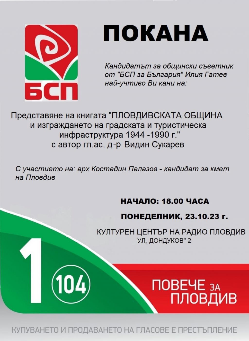 148 Кандидатът за общински съветник от „БСП за България“ Илия Гатев кани пловдивчани на представяне на книгата „Пловдивската община и изграждането на градската и туристическа инфраструктура 1944-1990 г.“ с автор гл.ас. д-р Видин Сукарев. Монографията представлява научно изследване върху градоустройственото развитие на Пловдив и политиката на местната власт. Обхваща периода от повратната историческа дата 9 септември 1944 г. до октомври 1990 г., когато свършва управлението на последния Окръжен народен съвет, на власт идва СДС и е назначено временно управление на града начело с Николай Сомлев. „Това е първото цялостно изследване за Пловдив по време на социализма със строго научен характер. Книгата е солидно подплатена с библиография и за източник са ползвани основно архивни материали. Разглежда развитието на реставрационните дейности в Стария Пловдив, основните квартали, водоснабдяването и канализацията, транспорта, хотелите и броя легла“ – разказва авторът.Книгата има интересна предистория. Преди 10 години по идея на тогавашния кмет Иван Тотев е възложено на колектив историци да съставят популярна история на Пловдив. На Видин Сукарев, като завеждащ музейния център за съвременна история, се паднало да пише за социализма. В последствие историкът се увлякал по темата и решил да я разработи в отделно разширено издание. Така се появява монографията „Пловдивската община и изграждането на градската и туристическа инфраструктура 1944-1990 г.“. Монографията е представена пред пловдивската общественост през пролетта и сега ще има втора презентация. Събитието ще се състои в понеделник, 23 октомври, от 18 ч. в Културния център на Радио Пловдив, ул. „Дондуков“ 2.На представянето ще присъства арх. Костадин Палазов – кандидат за кмет на Пловдив от „БСП за България“. Може да ви хареса също Слави Трифонов определи присъдата срещу Люпчо Георгиевски като поредна политическа антибългарска репресия Над 180 000 опита на мигранти да влязат у нас са предотвратени от гранични полицаи през миналата година Близо 3400 сигнала за изборни нарушения са постъпили в прокуратурата Кметът и общинските съветници в Кричим положиха клетва