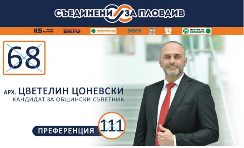 353 Aрх. Цветелин Цоневски – Общински съветник 2016-2023.Роден в гр. Пловдив – 30.10.1979гСемеен с две деца Завършва архитектура – магистър в УАСГ – гр. СофияОбменя опит с екипи от Русия, Финландия, Швеция и ТурцияЧлен на КАБ от 2009гОсновава компанията „ЦОНЕВСКИ ПК“ ООД – през 2011г. Компанията участва в изготвянето на повече от 1000 инвестиционни проекти в цялата страна. Успешно развива екипи от архитекти и инженери експерти в инвестиционното проектиране и управлението на проекти.От октомври 2016г – е Общински съветник в Община Пловдив, в листата на ПП „Кауза България“.Кандидат за Общински съветник от листата на КП „Съединени за Пловдив“ – Арх. Цоневски, Вие отново сте кандидат за Общински съветник, каква е ролята на един Архитект в Общинския съвет?Политиката не е крайна цел, тя е средство за постигане на заложените в програмата за управление цели. Трябва да узреем за мисълта, че интелектуалния и експертния елит задължително трябва да са част от управленския модел, с осъзнато и съпричастно отношение на всички жители на града.Моята цел като единствен архитект в Общинския съвет е да синтезирам, обобщя и представя позицията на експертите в устройствено планиране, да предложа и защитя една обща визия за развитие на нашия любим град и прилежащите му територии.Глобалният поглед, осъзнаването и разбиране на процесите в духа на устойчивото планиране и развитие е генезиса на успешното управление. – Какви са опорните точки, на които трябва да стъпи управлението на града, за да успеем да генерираме устойчиво развитие, за което говорите?Всичко материално и физическо, което ще се случи в града и съседните територии с хоризонт от 10 години е залегнал в един основен стратегически документ ПИРО /План за интегрирано развитие на община/. Съгласно предвижданията на този план и неговия индикативен бюджет като макрорамка Община Пловдив ще разполага за този период с 1 100 000 000 /един милиард и сто милиона/ лева.ПИРО съвместява проекти с различен начин на финансиране, като ОПЕС /Оперативни програми на Европейския съюз/, ПВУ /План за възстановяване и устойчивост/, Общинския и Държавния бюджет, и други източници.Първото нещо, което трябва да направим в следващия мандат е актуализация на този план като отворен стратегически документ в спешен порядък и подготовка на инвестиционни проекти, чрез които Община Пловдив ще може да кандидатства за финансиране.Второто нещо, което трябва да направи следващото управление на града е да инициира постоянен експертен диалог с ръководствата на съседните общини Марица и Родопи, ПИРО позволява и насърчава интегрирани съвместни инвестиционни намерения и проекти между отделните съседни общини и това е една великолепна възможност заедно с тези общини да реализираме мащабна инфраструктура отнасяща се до входно изходните артерии на града, транспортна свързаност между отделните населени места защо не и лифт до хижа „Здравец“. Към настоящия момент планът не е предвидил възможността за публично-частно партньорство, което за нас е много важно и се насърчават с възможност за външно финансиране. – Как може да се овладее хаотичното урбанизиране в южните територии на града?Съгласно ОУП /Общия устройствен план/ на Община Пловдив 10 000 000 кв.м към момента, предимно земеделски земи са блокирани за единични смяни на статути, това ни дава възмо