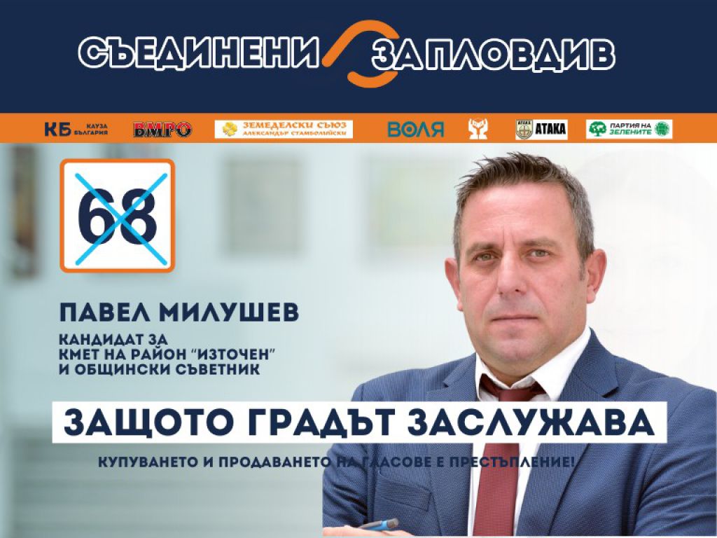 269 Кандидатът за кмет на район“Източен“ от Коалиция “Съединени за Пловдив“ Павел Милушев отговаря на три важни въпроса – По какъв начин жителите на район “Източен“ще участват в управлението, ако бъдете избран за кмет?Съвместно с гражданите на района ще създадем карта с актуални проблеми, за да можем един по един да ги решаваме. Ще имам приемен ден всеки ден и ще се срещам с тези, които са ме избрали. – Как ще гарантирате изпълнението на вашата програма?Никой кандидат за районен кмет не може да гарантира изпълнение на програмата си, ако няма необходимата подкрепа от общинския съвет. Хубавата новина е, че Коалицията „Съединени за Пловдив“ ще има сериозно присъствие в местния парламент с поне 15 общински съветника. Те са хората, които ще гарантират за изпълнението на нашата програма. – Има ли купуване на гласове във вашия район и ако да как смятате да се преборите със подобна практика?Партиите, участващи в Коалиция“Съединени за Пловдив“, са против купуването на каквито и да е гласове. Не знам как ние ще се преборим, ако институциите не си свършат работата. В „Столипиново“ сме организирали мобилни групи, които ще патрулират в района в деня на изборите и ще подават сигнали при забелязани нередности. Ще разчитаме и на помощта на медиите. Може да ви хареса също Слави Трифонов определи присъдата срещу Люпчо Георгиевски като поредна политическа антибългарска репресия Над 180 000 опита на мигранти да влязат у нас са предотвратени от гранични полицаи през миналата година Близо 3400 сигнала за изборни нарушения са постъпили в прокуратурата Кметът и общинските съветници в Кричим положиха клетва