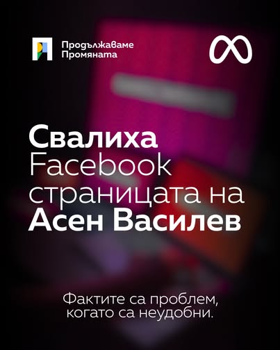 258 Meta свали Facebook страницата на Асен Василев. Това е станало без предупреждение и без мотиви, заявяват от ПП. От там пишат още, че преди дни същото се е случило и със страницата на „Българските Елфи”. „И в двата случая без предварителен имейл, без обяснение, в разрез със собствените правила на платформата. Според техническия екип на „Продължаваме Промяната“ става въпрос за целенасочено административно премахване под външен натиск. Подадохме сигнал към Meta и очакваме отговор. Ще бъдем още по-шумни”, пишат от партията във Facebook страницата си. Може да ви хареса също Борисов: Новият управител на „Лукойл“ е договорен, не е свързан с Пеевски Атанас Зафиров: Истинското лидерство е в трудните решения, а не в популисткия шум НС обсъжда повторно промените във върнатия от президента закон Лукойл Драгомир Стойнев: Този бюджет защитава интересите на работниците