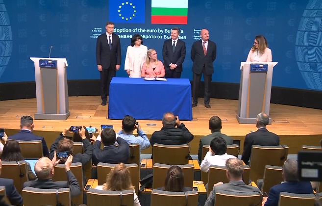 178 На официална церемония България беше приета в еврозоната. На нея присъединяването беше утвърдено чрез подписване на договор. На 8 юли страната ни беше окончателно приета в еврозоната след гласуването в Европейския парламент в Страсбург и на Съвета по икономически и финансови въпроси в Брюксел. „Сърдечно поздравявам българските ни приятели. За мен е чест да бъда свидетел на това историческо за вас събитие. Това е невероятно постижение за страната ви. Допускам, че е била необходима много усърдна работа, за да се стигне дотук. Желая ви успех“, каза датският министър на финансите и председател на ЕКОФИН Стефани Лосе. Дания пое ротационното председателство на ЕС от 1 юли за половин година. „За мен е привилегия да изкажа най-сърдечни поздравления към правителството. Спомням си, когато Ирландия се присъедини към еврозоната и видях първото евро. Това е много ползотворно за икономиката. Много работа беше необходима, за да се стигне до този етап. Еврото дава удобство и сигурност, това е валутата на споделените ценности. Желая успех на българската държава“, посочи председателят на Еврогрупата Пасхал Донахю. Зам.-председателят на Европейската комисия Валдас Домбровскис също поздрави страната ни. „Еврозоната е по-силна с членството на България, страната също ще стане по-силна. Поздравявам българските власти за това, че процесът беше доведен до положителен резултат. Приемането на еврото укрепва кредитния рейтинг, насърчава инвестиции, има положително въздействие върху растежа и носи сигурност. В дългосрочен план еврото прави цените стабилни и укрепва показателите при шокови сътресения. Сега фокусът е върху процеса. България трябва да продължи с реформите – да се запази темпът им, за да се ускорят ползите от членството в еврозоната. Искам да успокоя гражданите, които се притесняват от присъединяването – имаме потвърдени данни за положителното влияние в дългосрочен план“, подчерта той. Заместник-председателят на Европейската централна банка Люис Де Гиндос посочи, че процесът по приемането е започнал през 2007 г. „Еврото дава стабилност и ползи за гражданите. Въвеждането му е и важна стъпка напред в икономическата интеграция. Присъединяването на България показва, че сме по-силни само заедно. Европа е по-силна, когато е обединена срещу нестабилните икономически фактори. Управителят на БНБ ще стане част от Управителния съвет на ЕЦБ. Приемането на единната валута бележи важна стъпка напред в икономическата и парична интеграция на ЕС в духа на единство. Еврозоната продължава да бъде привлекателен проект“, заяви Де Гиндос, пише Nova. Финансовият министър на България Теменужка Петкова определи деня като исторически. „Постигнахме своя стратегическа цел. Този успех е резултат от дългогодишната и упорита работа на страната ни. Преди 5 години правителството с премиер Бойко Борисов и финансов министър Владислав Горанов направи възможно влизането ни в чакалнята на еврозоната. Без тази решителна стъпка днешният успех би бил невъзможен. Членството ни в еврозоната е предпоставка за икономическа и финансова стабилност, за по-добро развитие на бизнес средата и по-добър стандарт на живот. Благодаря на всички, които бяха по пътя заедно с нас – Еврогрупата, ЕК, ЕЦБ, българското правителство, МФ и БНБ. Положихме невероятни усилия, за да стигнем до тоз