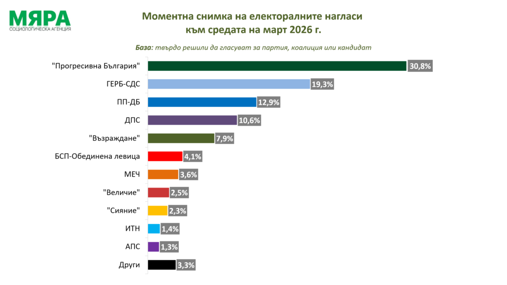 25 Ако изборите бяха в средата на март, декларативната подкрепа сред заявяващите, че ще гласуват за определена партия и коалиция или кандидат, изглежда по следния начин според агенция „Мяра“: Формацията на Румен Радев „Прогресивна България“ би спечелила 30,8% от гласовете, ГЕРБ-СДС – 19,3%, „Продължаваме промяната-Демократична България“ – 12,9%, ДПС – 10,6% и „Възраждане“ – 7,9%. Около бариерата би била БСП-Обединена левица с текущ резултат „на ръба“ с 4,1%, недалеч от МЕЧ – с 3,6%. „Величие“ би имало 2,5%, а „Сияние“ влиза отчетливо в битката за ръст – с 2,3%. „Има такъв народ“ би получила 1,4%, а АПС – 1,3%. В битката към процент, от днешна гледна точка, могат да се различат формации като „Синя България“, „Антикорупционен блок“ и т.н. Данните са от независимата ежемесечна изследователска програма на социологическата агенция „Мяра“. Данните са на база решили да гласуват за определени формации и кандидати и не са прогноза за изборен резултат, а моментна снимка на електоралните нагласи. При цялата условност на изборните списъци, както и на декларативната природа на отговорите на респондентите, потенциална активност остава близо до половината от пълнолетните българи – 49,1% или по-висока в сравнение с обявяваното от респондентите преди предходни избори, т.е. с възможност да надвиши три милиона. 1,8% от всички заявяващи, че ще гласуват, твърдят, че възнамеряват да гласуват с „Не подкрепям никого“. Данните са от независимо изследване от редовната изследователска програма на социологическата агенция „Мяра“. Изследването е проведено „лице в лице“ с таблети между 7и 16 март 2026 г. сред 809 пълнолетни български граждани. Максималната стандартна грешка е ±3,5 при 50% дялове. 1% от цялата извадка (а не от гласуващите) се равнява на близо54 000 души. Може да ви хареса също Над 34 500 души са изразили желание да гласуват в чужбина на парламентарните избори през април ГЕРБ даде старт на кампанията в Пловдив: Срещи очи в очи и реални действия Старт на предизборната кампания Прогресивна България с амбиция за реална промяна: Радев обяви курс към демонтаж на олигархията и икономически растеж