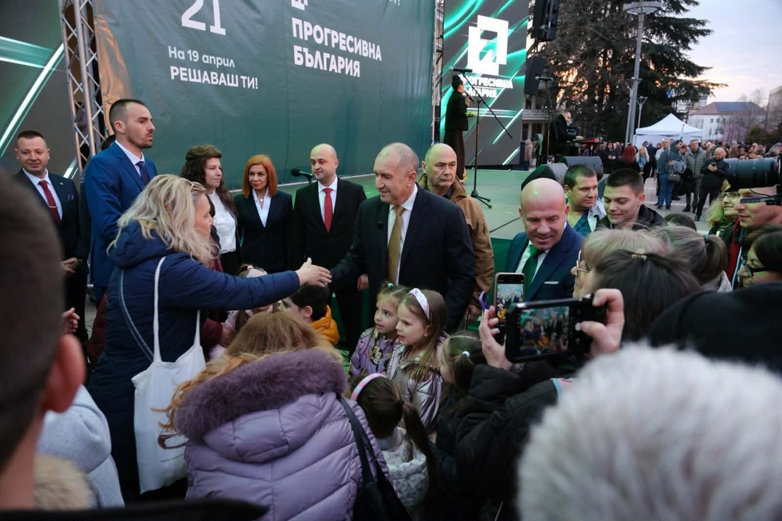 319 „Твърде дълго търпяхме безчинствата на олигарси и корупционери. Ще си върнем силата и закона там, където му е мястото – при българския народ. За да го сторим, ние вече предприемаме учредяването на партия „Прогресивна България“. Нашата учредителна декларация е готова и всички ние ще разчитаме на вас за едно по-добре бъдеще на България”. Това заяви президентът (2017 – 2026 г.) Румен Радев на среща днес с гражданите на Ямбол на площада пред Общината. „Вашата енергия на този пълен площад е вдъхновяваща, защото наистина се вдига политическа вълна и това се вижда в цялата страна”, каза лидерът на „Прогресивна България”. Президентът (2017 – 2026 г.) Румен Радев отбеляза, че първостепенната задача на коалицията е изхвърляне от власт на олигархията, смяна на състава на ВСС и избор на нов легитимен главен прокурор, ревизии на ключови обществени поръчки, работа с партньорски служби за издирване на банкови сметки, имоти и активи на български граждани в чужбина с неясен и незаконен произход. „Нека проверим, как има хора, които цял живот са били на държавна заплата, а живеят в огромни палати и то не един и не два. Как се случва това? Какви са тези поставени лица, на които се водят тези палати и имущества, и всякакви ултрамодерни джипове? Да видим дали техните доходи съответстват на имуществата!”, заяви Румен Радев. „Другата наша основна задача е постигането на силна икономика, защото без нея не можем да развиваме никаква социална дейност. Ако искаме да имаме качествено образование, здравеопазване, социални услуги, ние предлагаме детайлни мерки как да ускорим икономическия растеж, как да подкрепим нашия български бизнес, как да докараме инвеститори”, посочи Румен Радев. „Ако всички заедно на 19 април излезем и гласуваме за справедливост, за достойнството ни и за прогресивна България и получим мнозинство, много бързо ще изведем България по пътя на ускореното развитие”, подчерта още Румен Радев. Може да ви хареса също Румен Радев: Новото след присъединяването ни към „клуба на богатите”, е че вересиите в селските бакалии са в евро Емил Янков: Заради порочна схема Пловдив остава без „Топъл обяд“ от 16 май Прогресивна България организира среща-дискусия със студенти от пловдивските университети на тема „България, в която искаш да живееш“ Румен Радев се среща днес с жители на Дупница и Благоевград