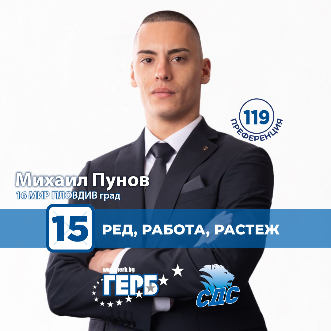 212 „Днес България има нужда от сигурност, ясна посока и реални резултати. Гласът за ГЕРБ е глас за управление, което може да носи отговорност, да взема решения и да ги изпълнява“ – в това вярва Михаил Пунов, 19-и в листата на ГЕРБ–СДС в Пловдив. Като студент по публична администрация в Пловдивския университет и активно развиващ се професионалист в сферата на дигиталния маркетинг и видео продукцията, Михаил Пунов съчетава академични знания с практически опит в комуникацията и създаването на съдържание. Младият мъж вярва, че съвременната администрация трябва да бъде не само ефективна, но и достъпна, прозрачна и технологично ориентирана. Според него дигитализацията не е просто тенденция, а необходимост, която може да подобри значително връзката между институциите и гражданите. „Когато институциите комуникират честно и ясно, хората им вярват. Това е основата на всяко работещо управление. България има потенциала да изгради модерна администрация, която работи бързо, прозрачно и в полза на хората. Това минава през внедряване на дигитални решения и нов начин на мислене“, отбеляза Пунов. Той акцентира и върху ролята на младото поколение в този процес. „Младите хора не трябва да стоят встрани от обществените процеси. Ние имаме идеи, енергия и желание за промяна. Време е да бъдем активна част от вземането на решения“, допълни Михаил Пунов. Дигиталният маркетинг и създаването на видео съдържание му дава пряк поглед върху съвременните комуникационни тенденции и поведението на аудиторията. Той вярва, че именно тези умения могат да бъдат полезни за по-доброто взаимодействие между институциите и гражданите. В личен план Михаил Пунов споделя, че спортът и създаването на видео съдържание са важна част от ежедневието му, тъй като му помагат да поддържа баланс и креативност. С кандидатурата си той заявява амбицията да бъде част от едно ново поколение лидери, които съчетават знания, практически умения и визия за бъдещето на България. „ГЕРБ–СДС не е просто политически избор – това е избор за стабилна държава, работещи институции и развитие, което се вижда и усеща от хората. Време е да изберем посока напред, а не да губим време в експерименти“, апелира Михаил Пунов. На 19 април гласувайте с №15 за ГЕРБ–СДС и с преференция 119 за Михаил Пунов! Може да ви хареса също ВАС отхвърли жалби срещу решението на ЦИК за местата и броя на секциите в чужбина Румен Радев: Управлението трябва да понася отговорност, особено когато е погазило обществения интерес Стабилни доходи, шанс за кариера и повече ред – младите очертаха България, в която искат да живеят по време на дискусия с „Прогресивна България“ Галъп с ново проучване: Партията на Радев с 27.7%, ГЕРБ-СДС – 22.8%